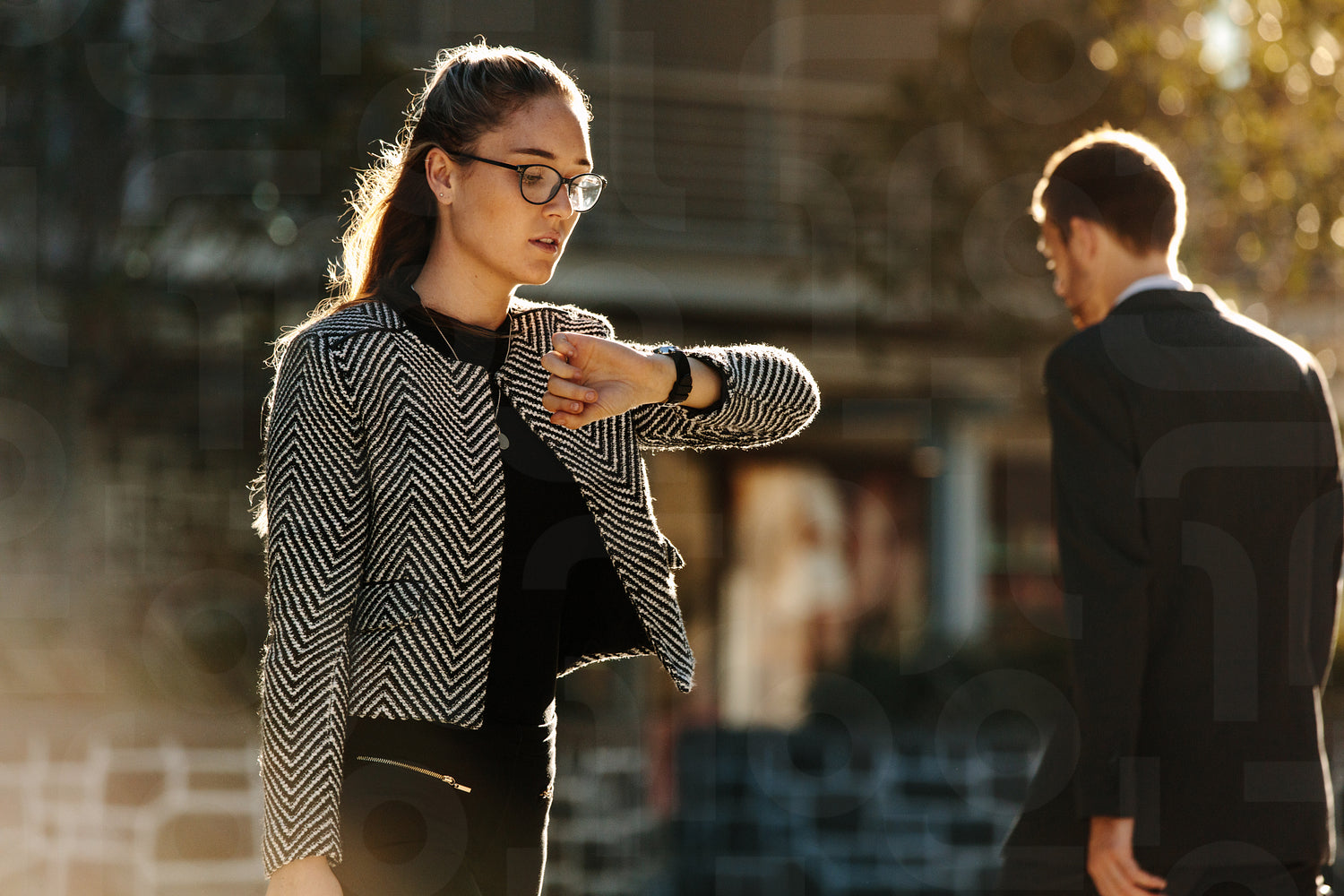Woman looking at her wrist watch while commuting to office in the morning. Woman going to office checking time while walking on street with sun flare in the background.