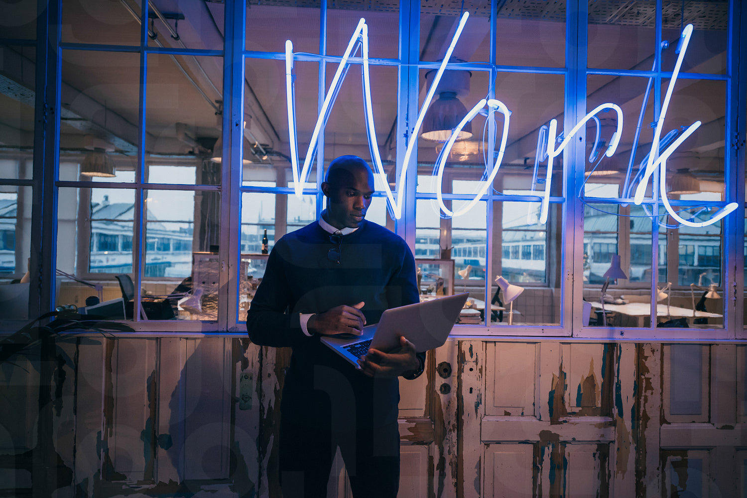 African young man standing in office using laptop computer. Business executive in office with big neon light work sign at the back on wall.