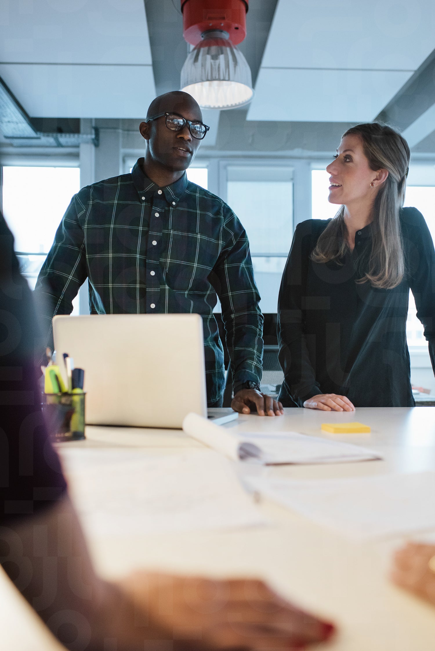 Business people discussing ideas during a meeting around a table in office. Diverse team of young professionals working on new business plan. Multiethnic executives brainstorming during meeting.