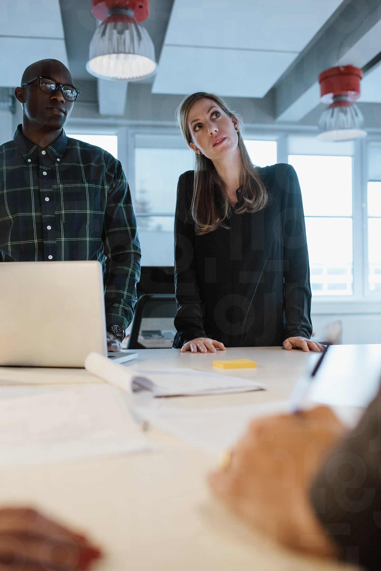 Business people during a meeting around a table in office. Diverse team of young professionals working on new business plan.