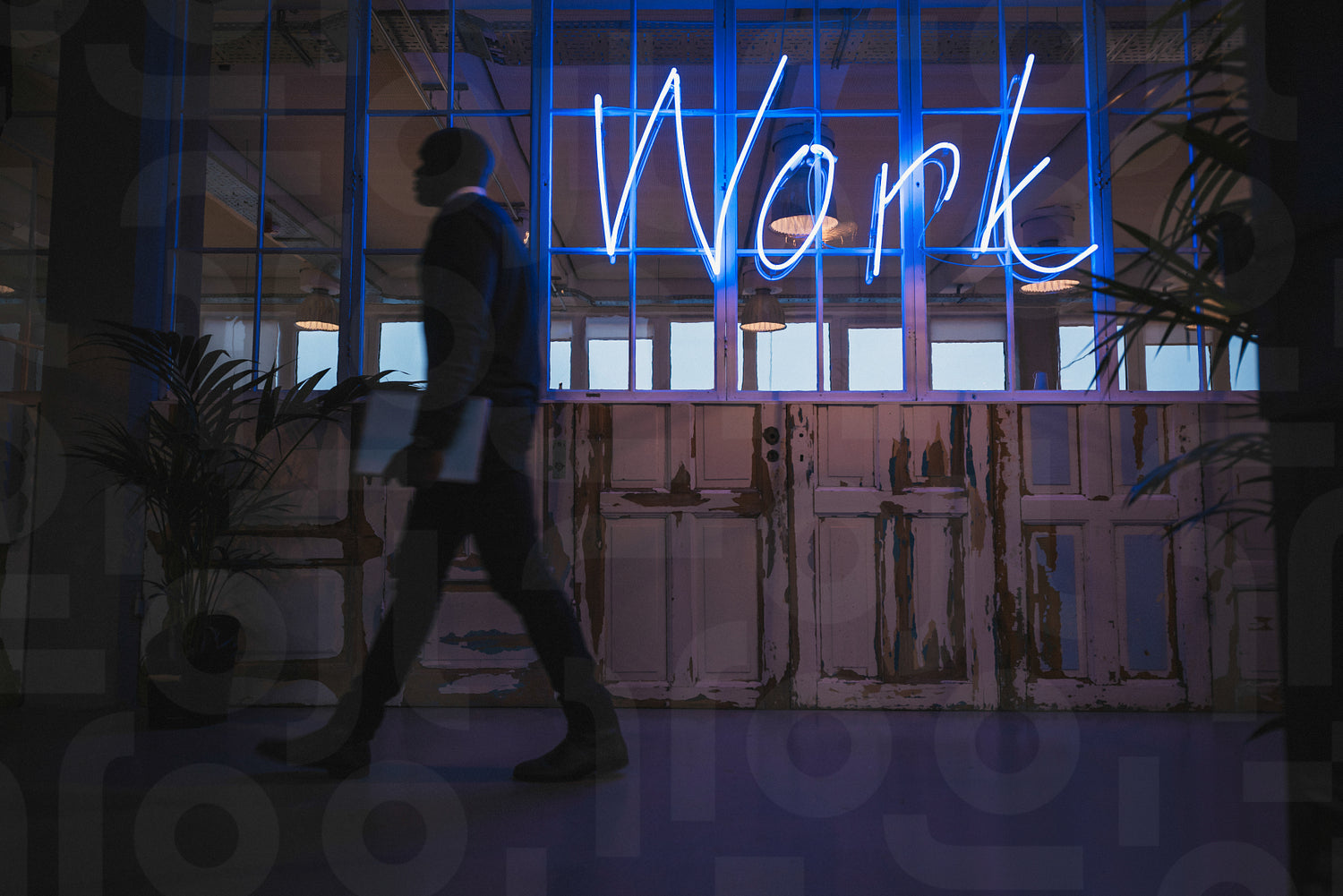 Corridor of a modern office with a neon work sign and executive walking by.