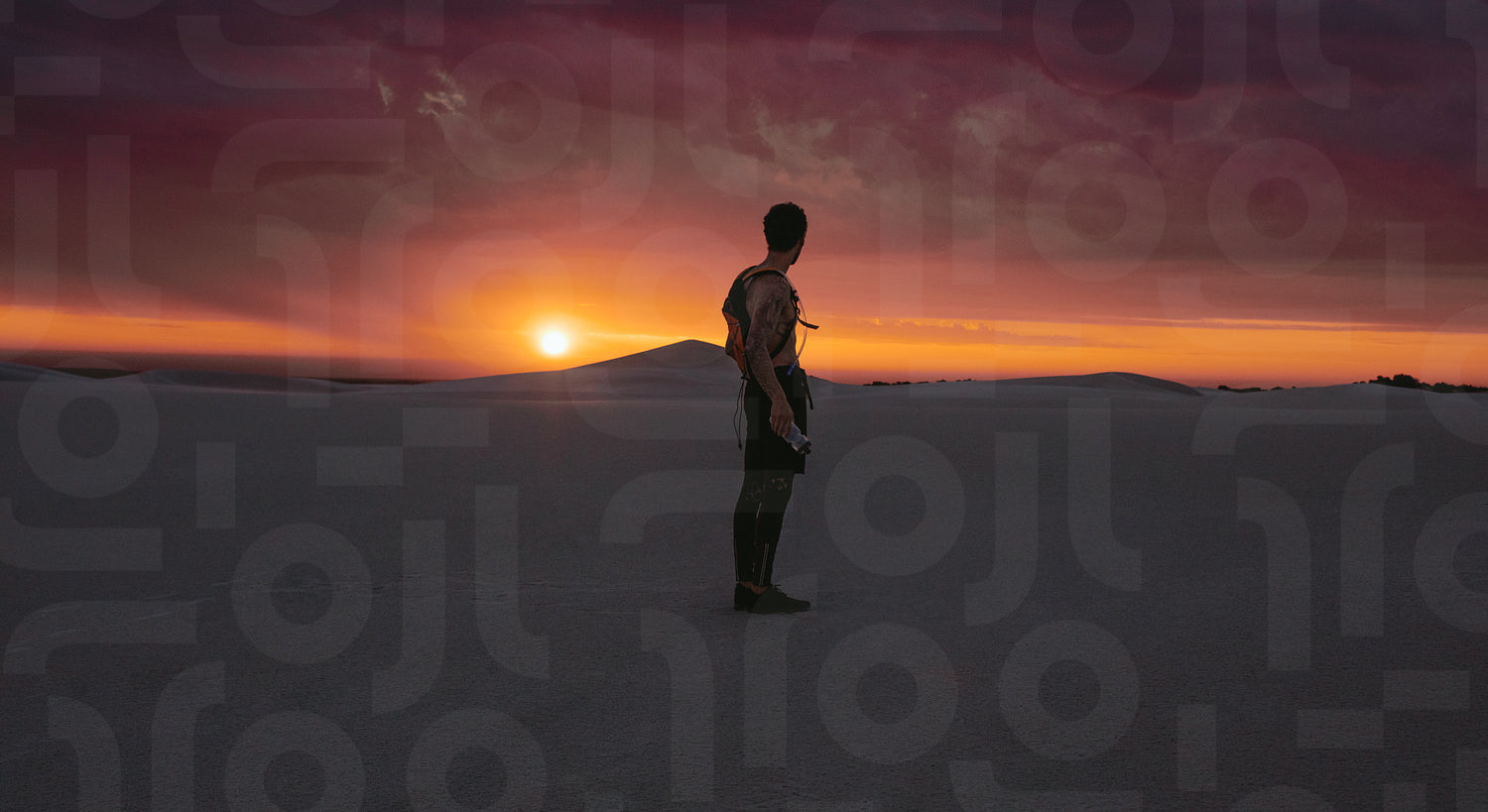 Man looking at desert sunset while exercising. Male athlete taking break from exercising on sand dunes.