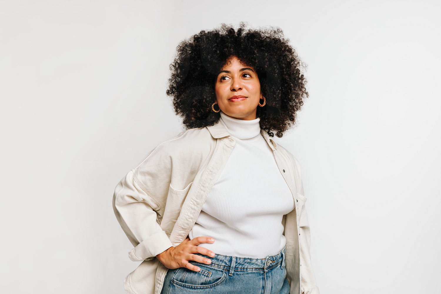 Attractive woman with an Afro hairstyle looking away pensively while standing against a studio background. Self-confident woman of colour wearing her curly hair with pride.