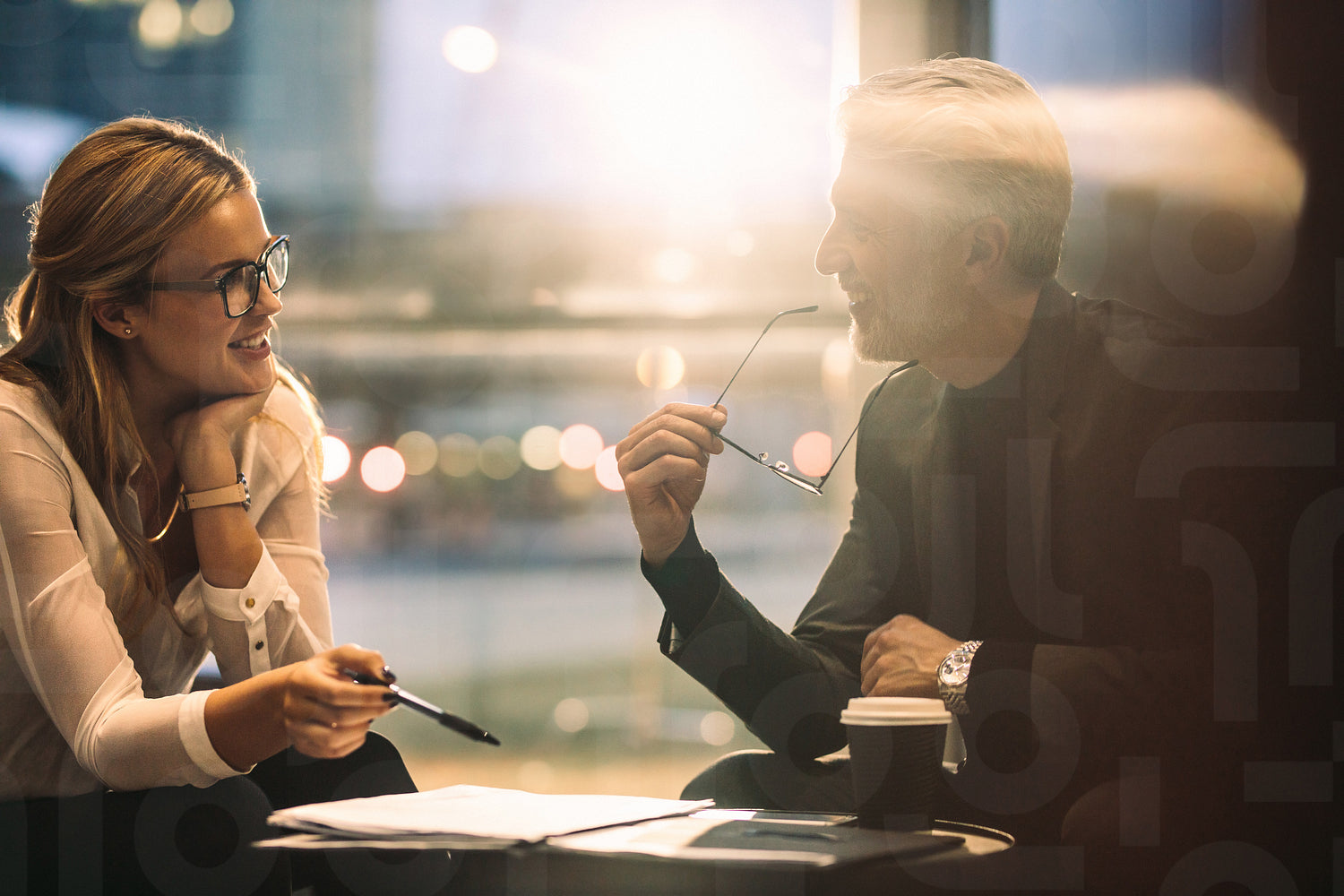 Businesswoman discussing with mature male colleague in office lobby. Business people working late in office.