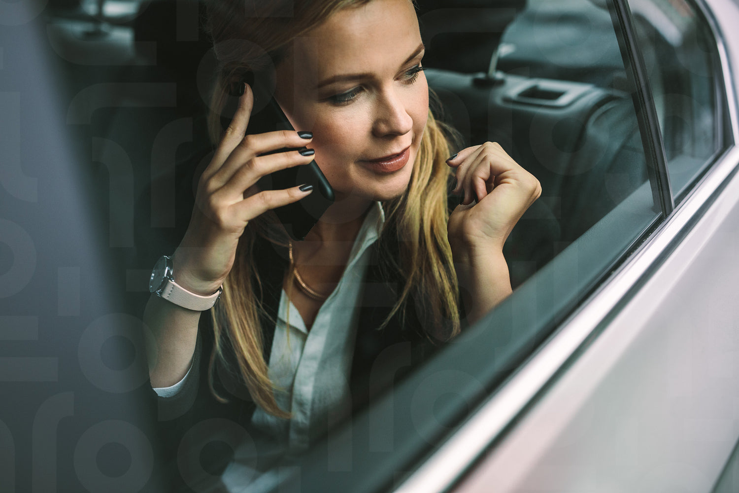 Young businesswoman talking on the cellphone while sitting on back seat of a car. Caucasian female executive travelling by a taxi and talking on mobile phone.