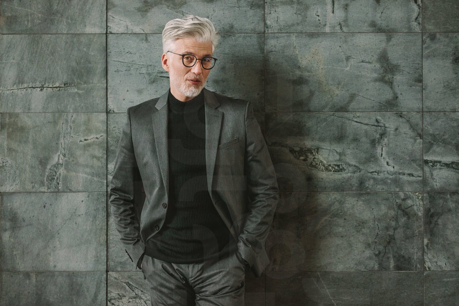 Portrait of handsome mature man in business suit standing on grey wall. Stylish businessman standing with hands in pocket and looking at camera.