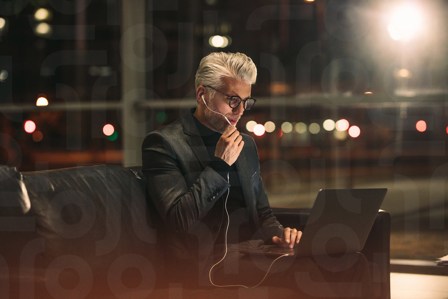 Mature businessman sitting in office lobby and making a video call. Businessman working late at night in office.