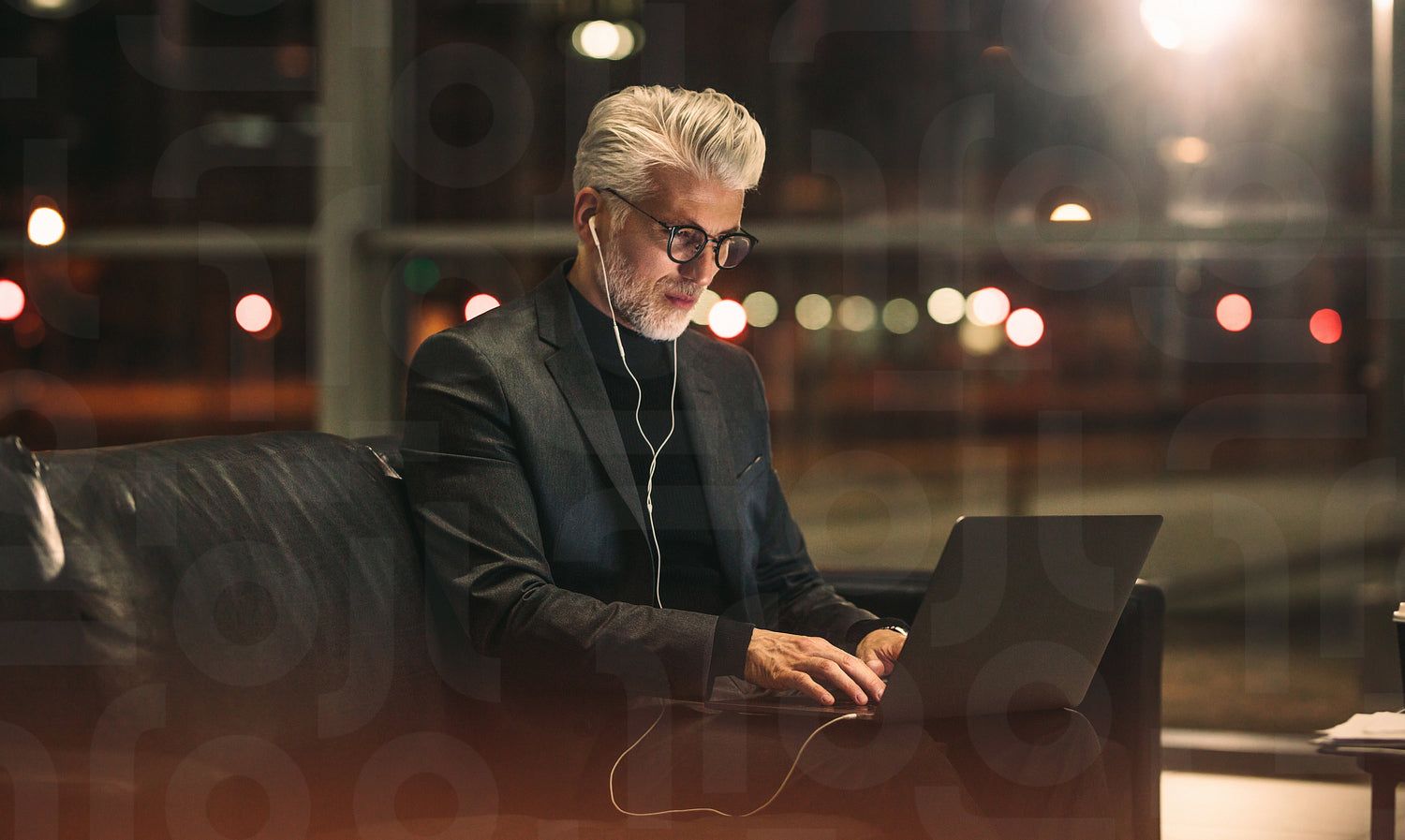 Mature businessman working on laptop late at night in office. Caucasian man in business clothes suing laptop computer in office lobby.