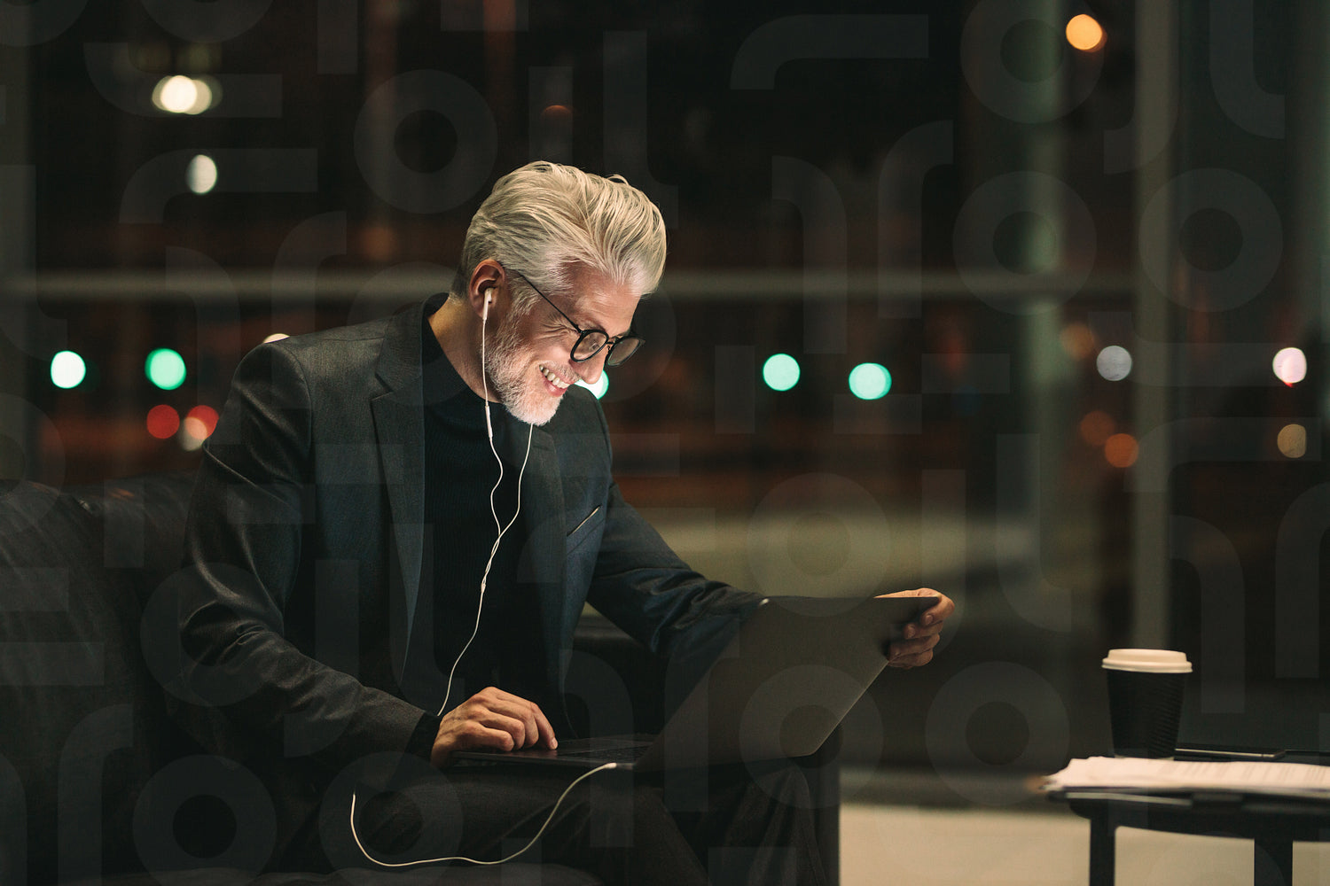 Smiling mature businessman working late on laptop