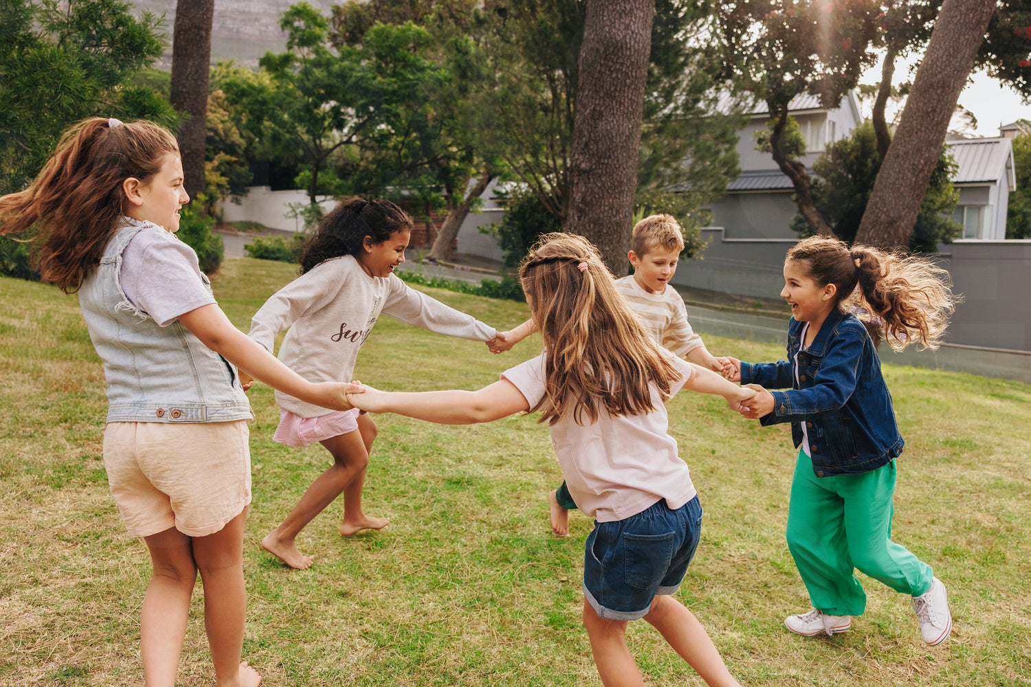 Group of children holding hands and playing outdoors in a green park. A joyful scene of fun, friendship, and leisure under bright sunlight.
