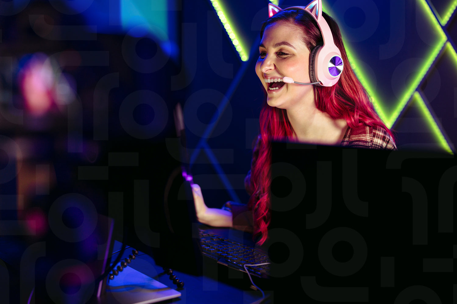 Woman enjoying playing a video game and live streaming for her fans