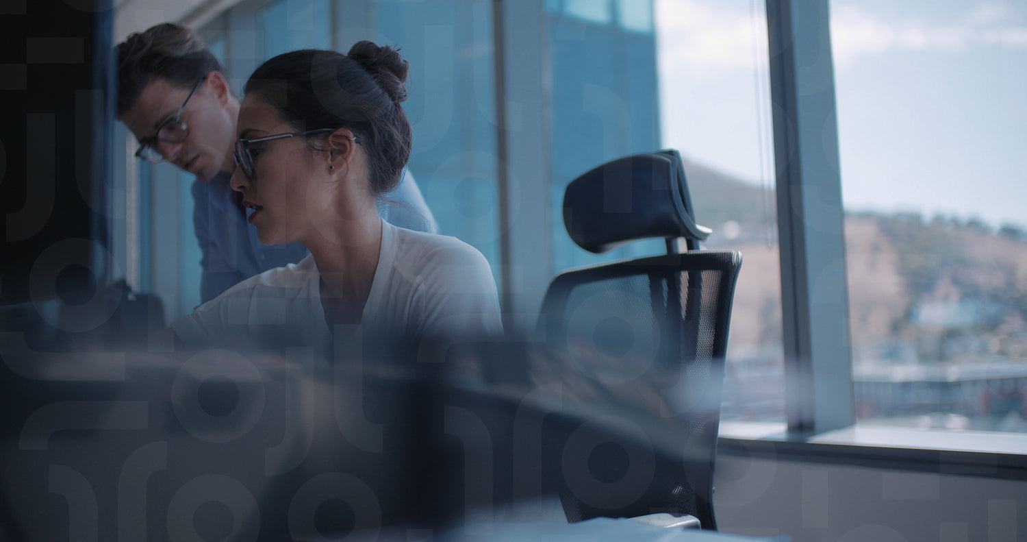 Businesswoman working on computer and talking with male colleague. Business colleagues work in office.