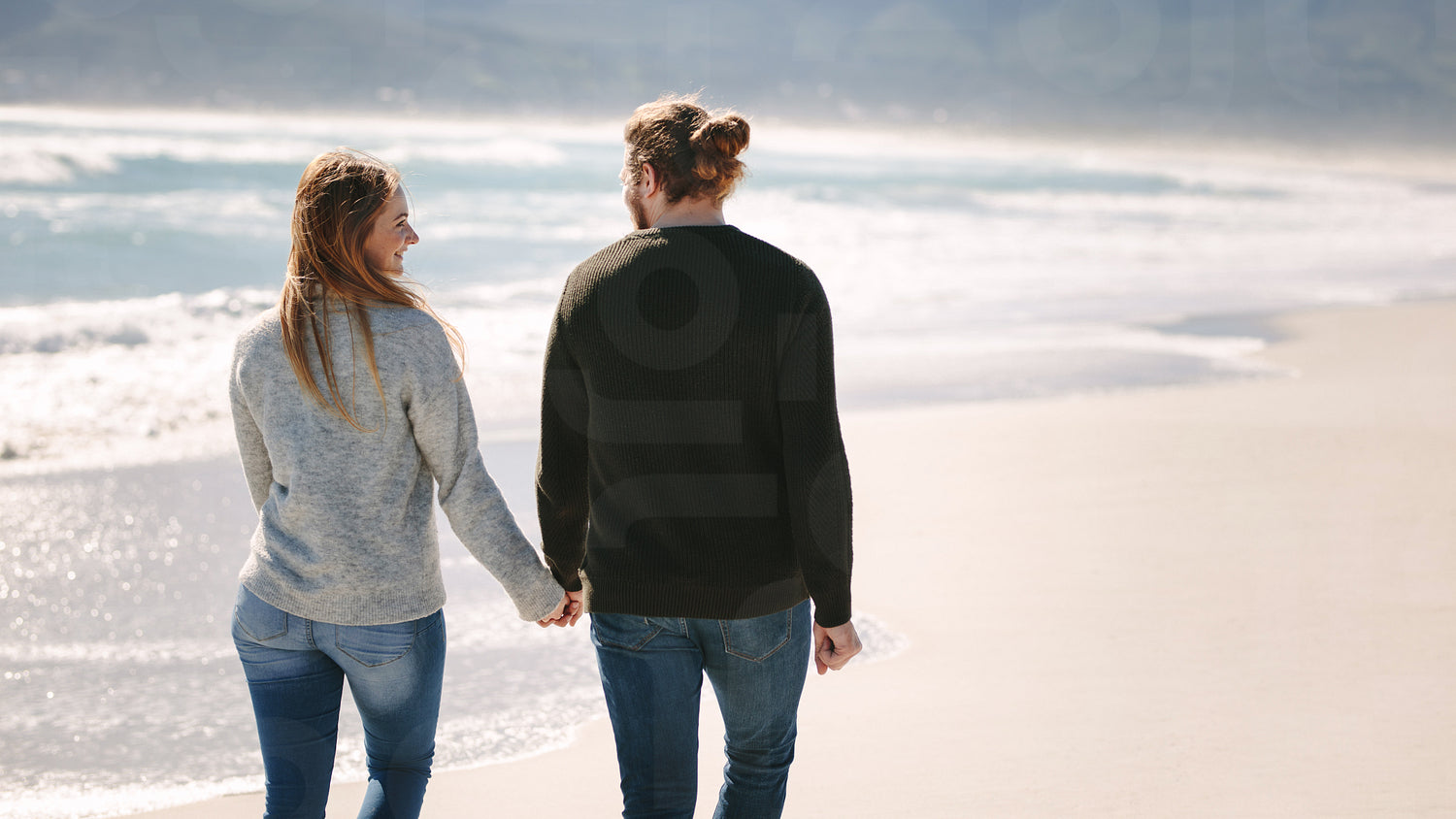 Rear view of romantic couple walking hand in hand on the beach. Man and woman taking a walk along the sea shore.