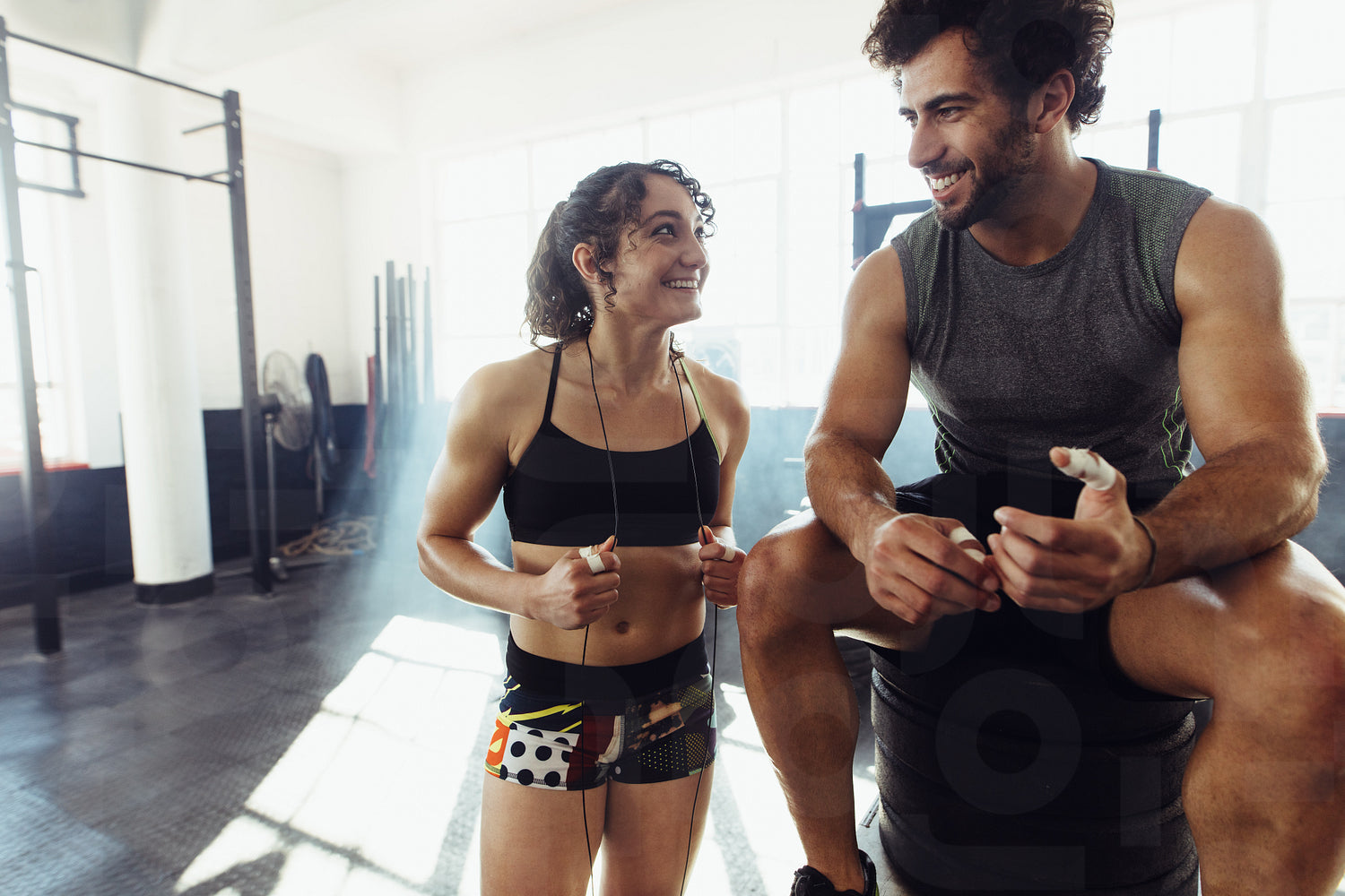 Athletic couple resting between exercises in the gym. Happy young man and woman in sportswear in the gym relaxing after heavy workout.