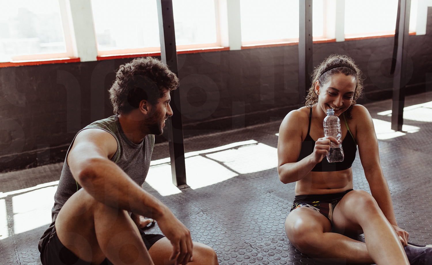 Young people sitting on floor and relaxing in gym after training with woman drinking water. Couple relaxing after workout session at gym.