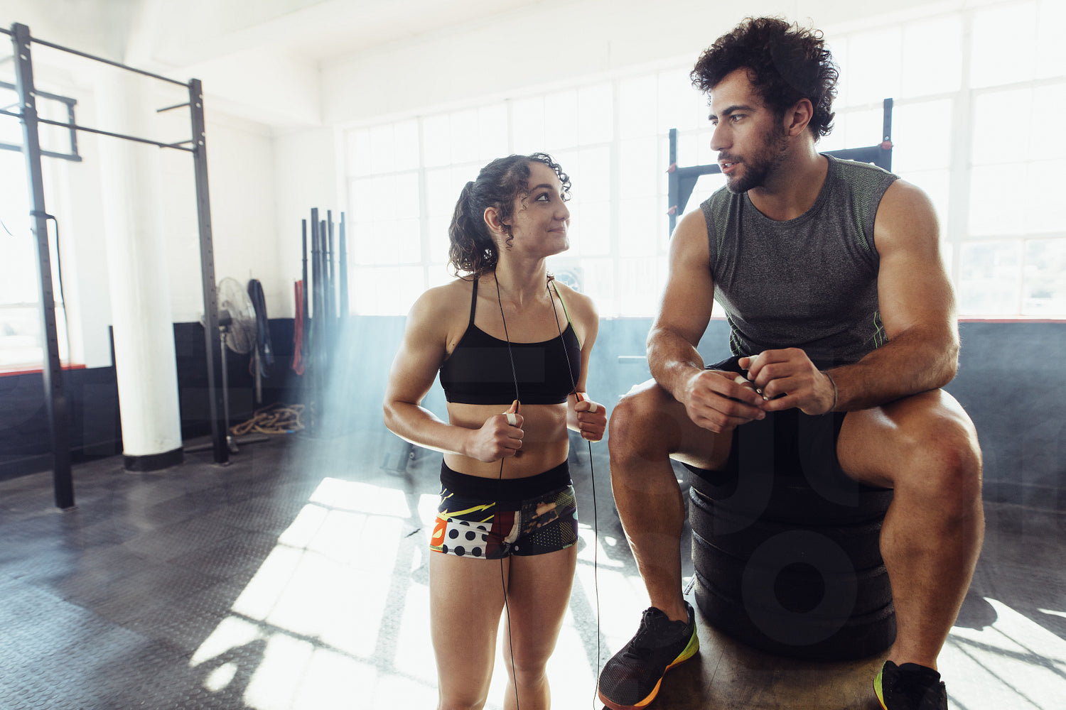 Fitness couple relaxing between exercises in the gym. Man and woman in in the gym resting after heavy workout. Taking a break after physical training session.