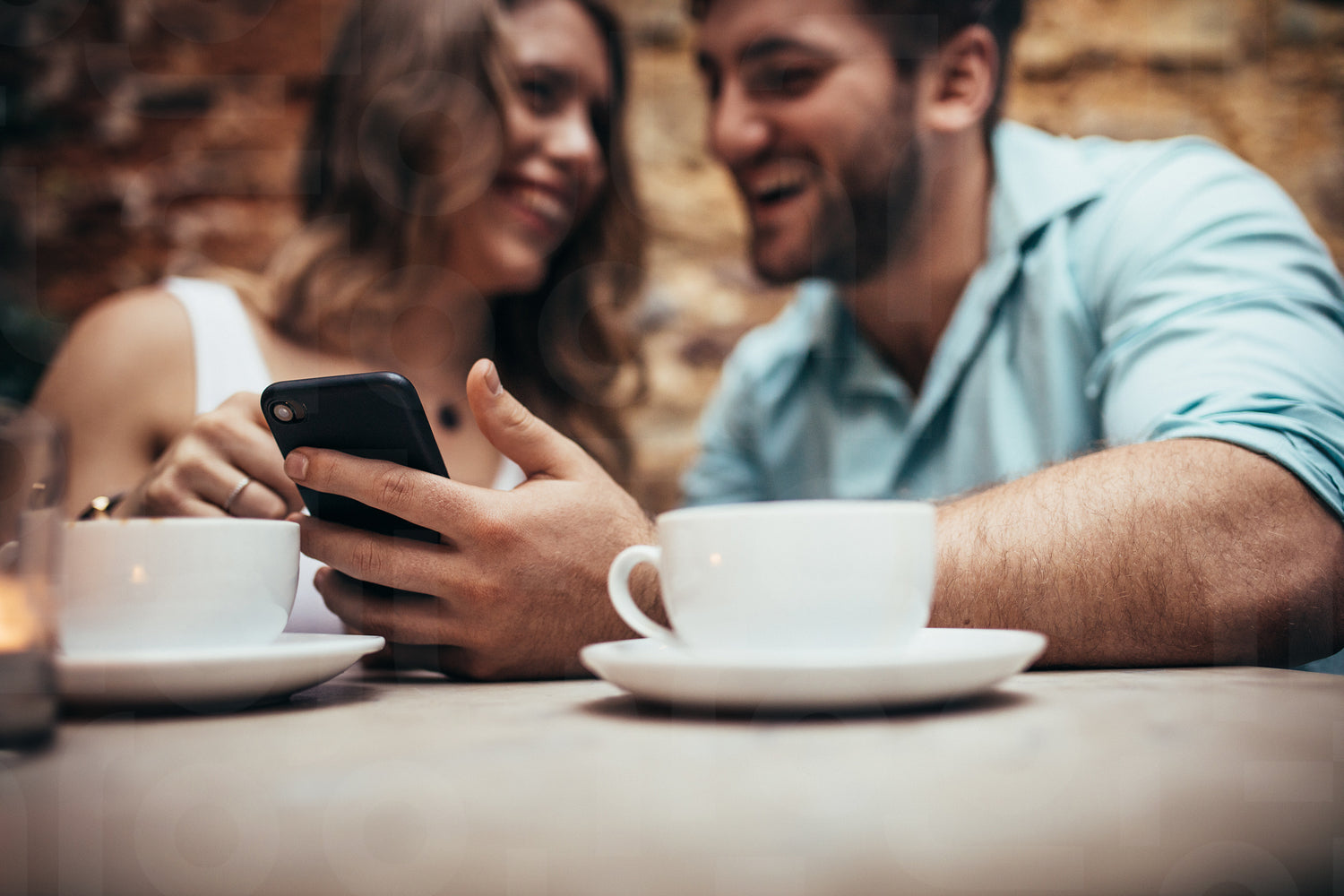 Smiling couple at a coffee shop spending time together talking. Man sitting at a restaurant with his girlfriend and looking at his mobile phone.