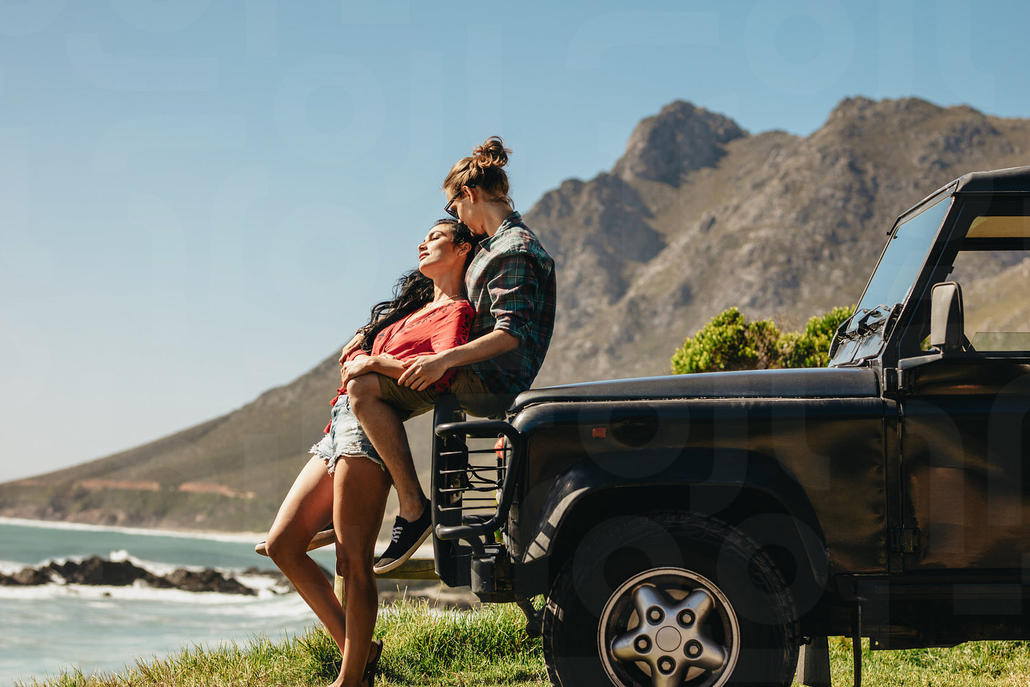 Romantic young couple sharing a special moment on roadtrip. Couple in love by their car at the beach.