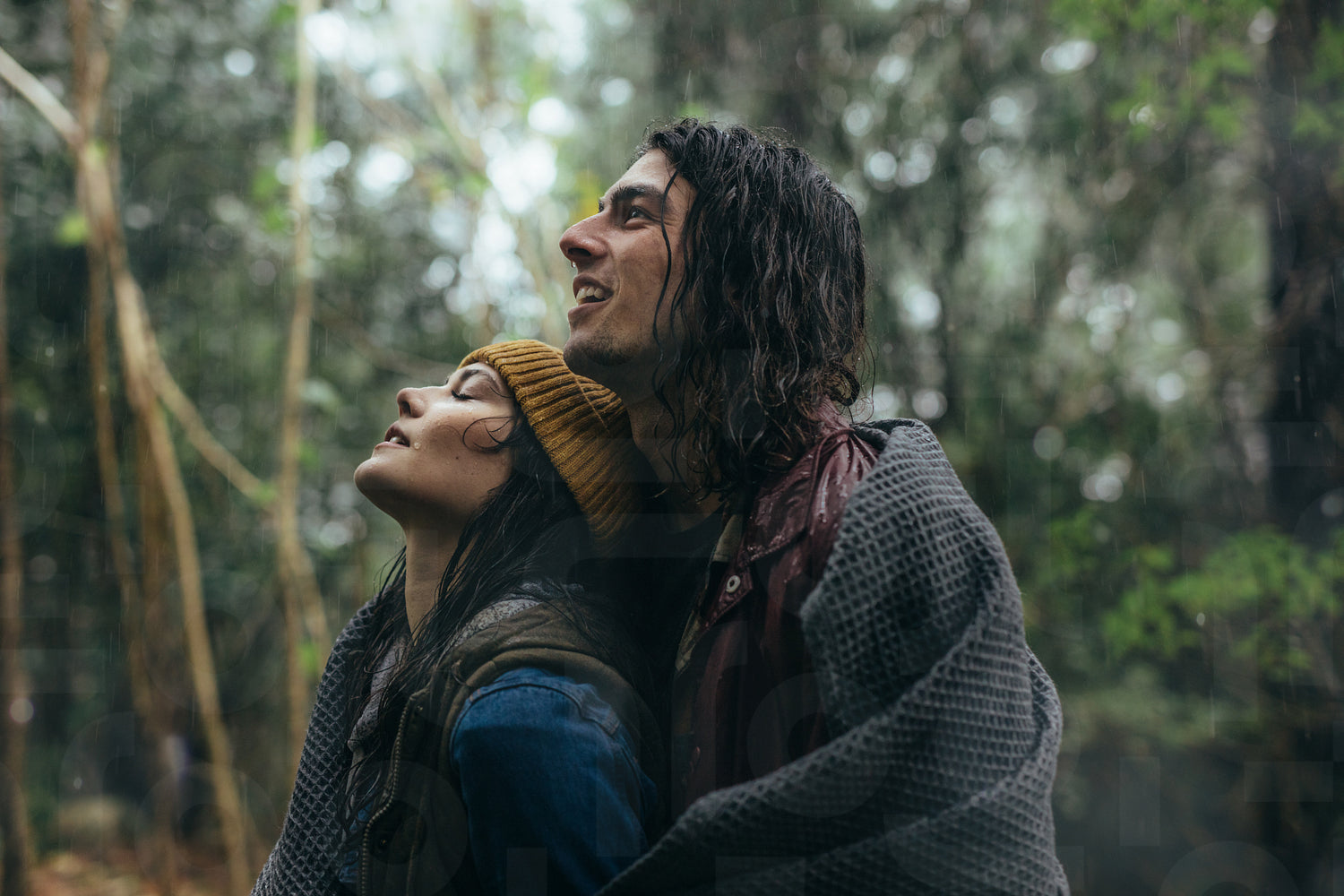 Portrait of young couple covering themselves with blanker while standing under rain in park. Beautiful couple spending time together in rain.