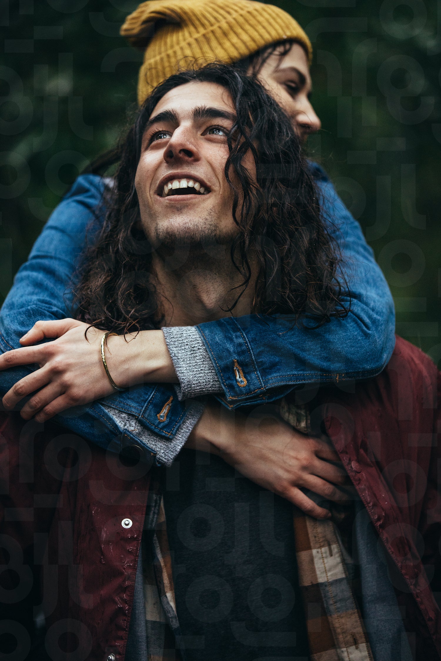 Portrait of young couple piggybacking in rain outdoors. Handsome young man carrying his girlfriend on his back at the forest on a rainy day.