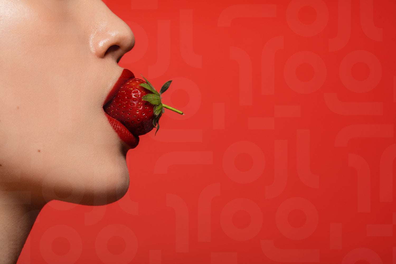 Side view of a young woman with a strawberry in her mouth against red background. Woman with red lipstick eating a fresh strawberry.
