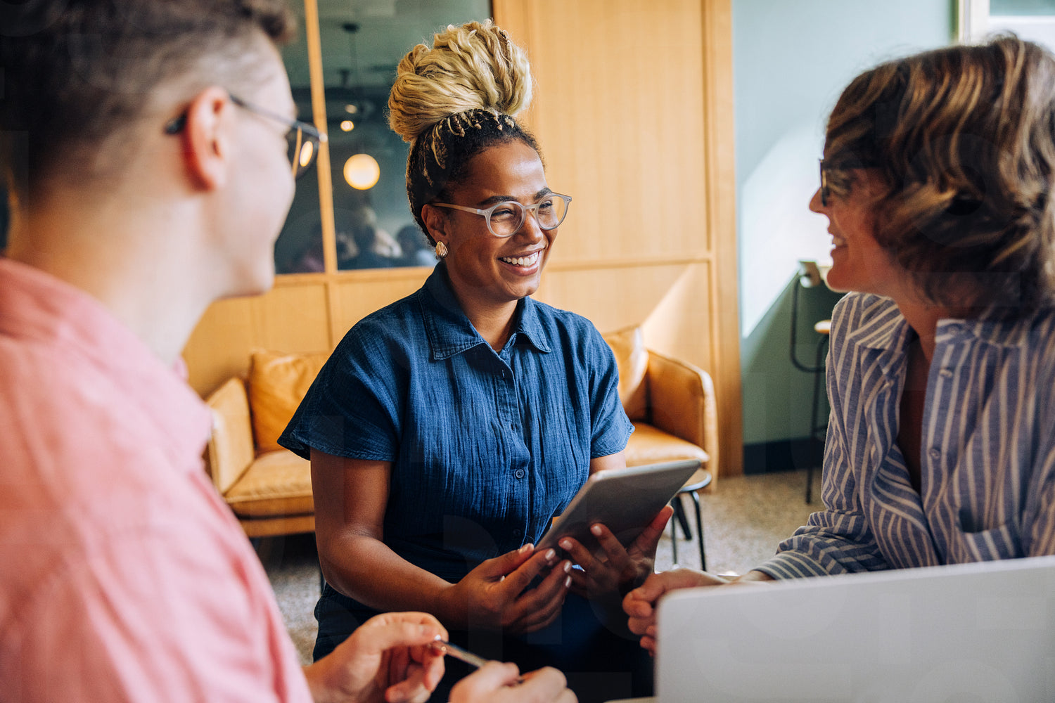 A cheerful interaction among coworkers discussing a project in a contemporary shared office.The relaxed seating and bright lighting both professional collaboration and friendly rapport.