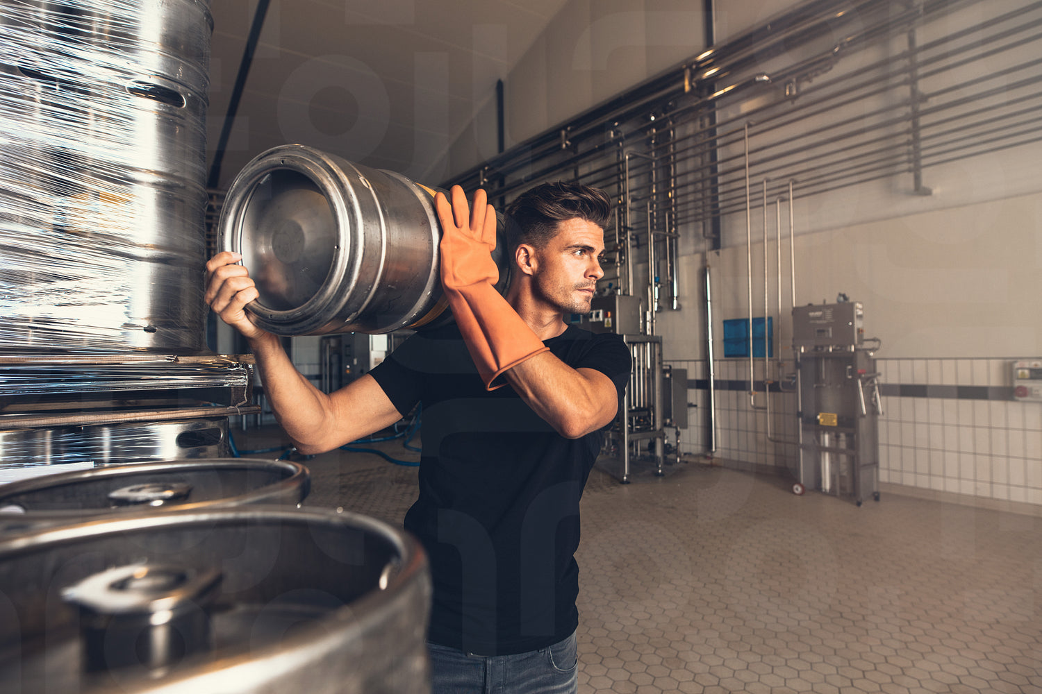 Brewer with large metal container at brewery factory. Young man working at warehouse in brewery. Arranging metal beer barrel at storage area.
