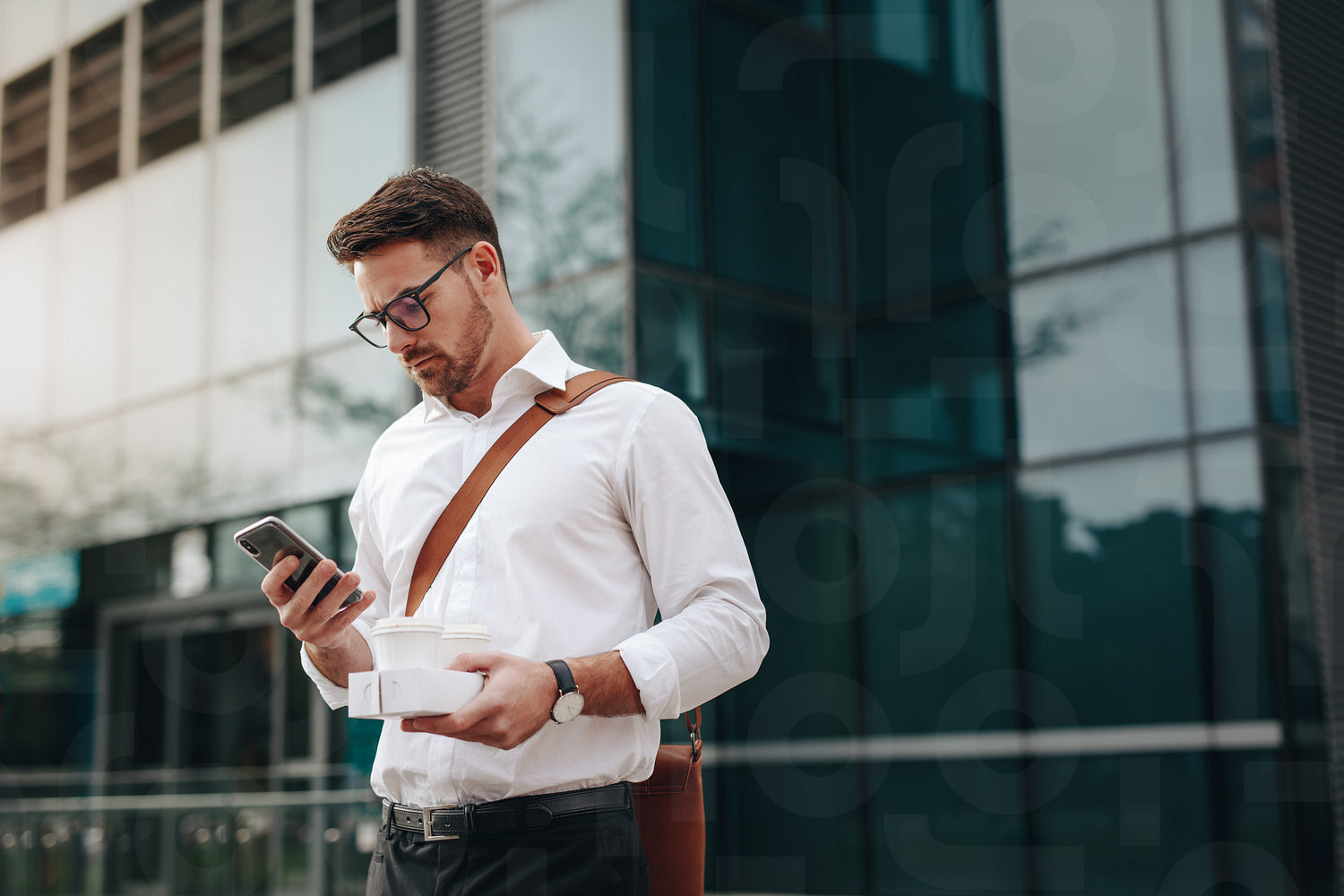 Businessman looking at his mobile phone standing outside a glass façade building. Man holding two coffee cups in hand using mobile phone standing outdoors.