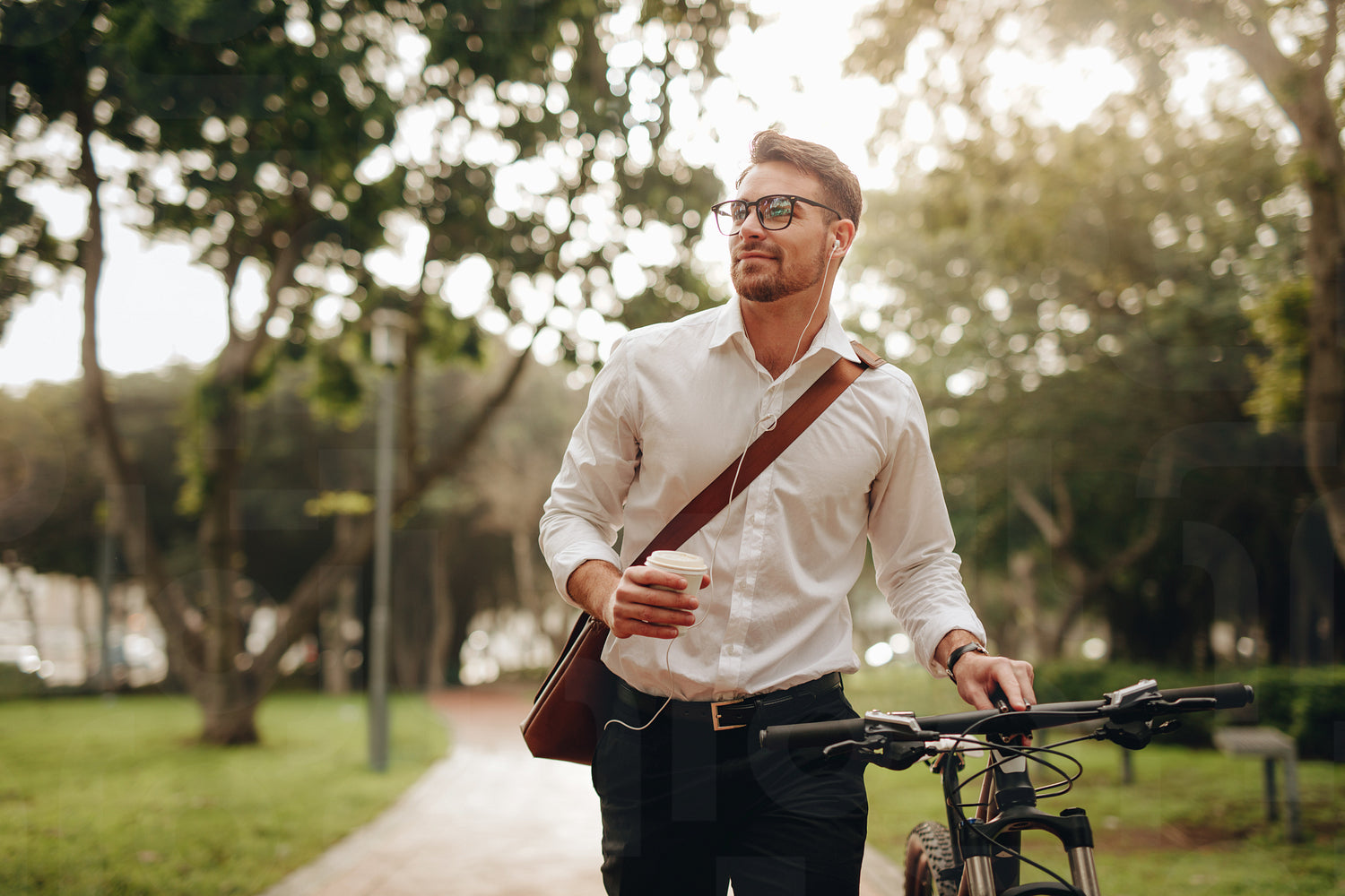 Businessman listening to music and enjoying coffee while walking to office with his bike. Man enjoying his commute to office walking with his bicycle and a coffee cup in hand.
