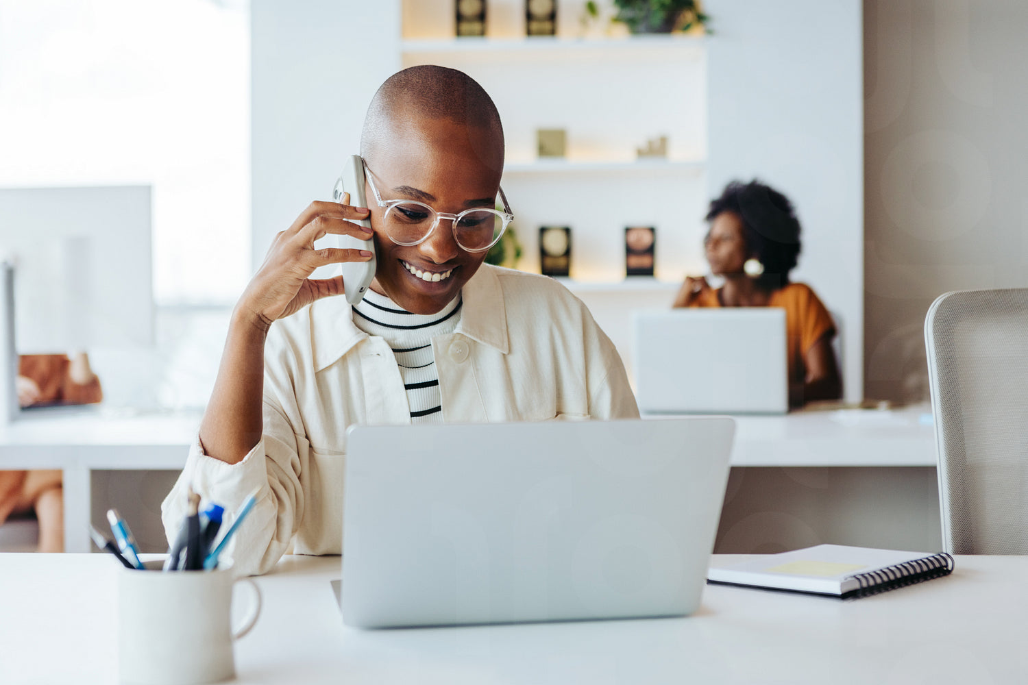 Happy, young businesswoman engages in a phone conversation while working on her laptop in a modern office environment. The background shows a colleague focused on work.