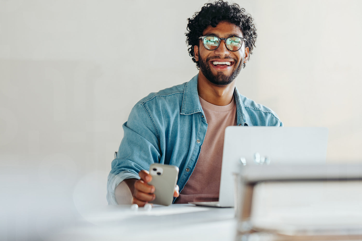 Portrait of a young, smiling businessman in casual attire works diligently with his smartphone and laptop in a bright office space, exuding a vibe of productivity and contentment.