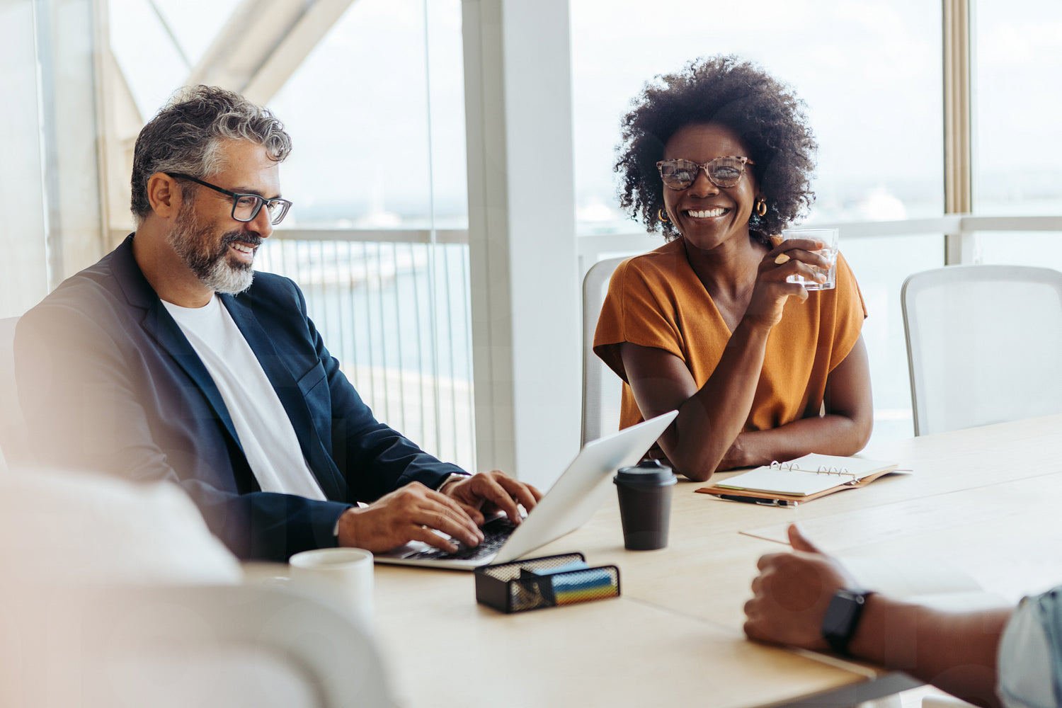 Creative professionals sitting in a modern office, brainstorming ideas for a project. They are collaborating and working together, demonstrating great teamwork and cooperation in a productive business meeting.