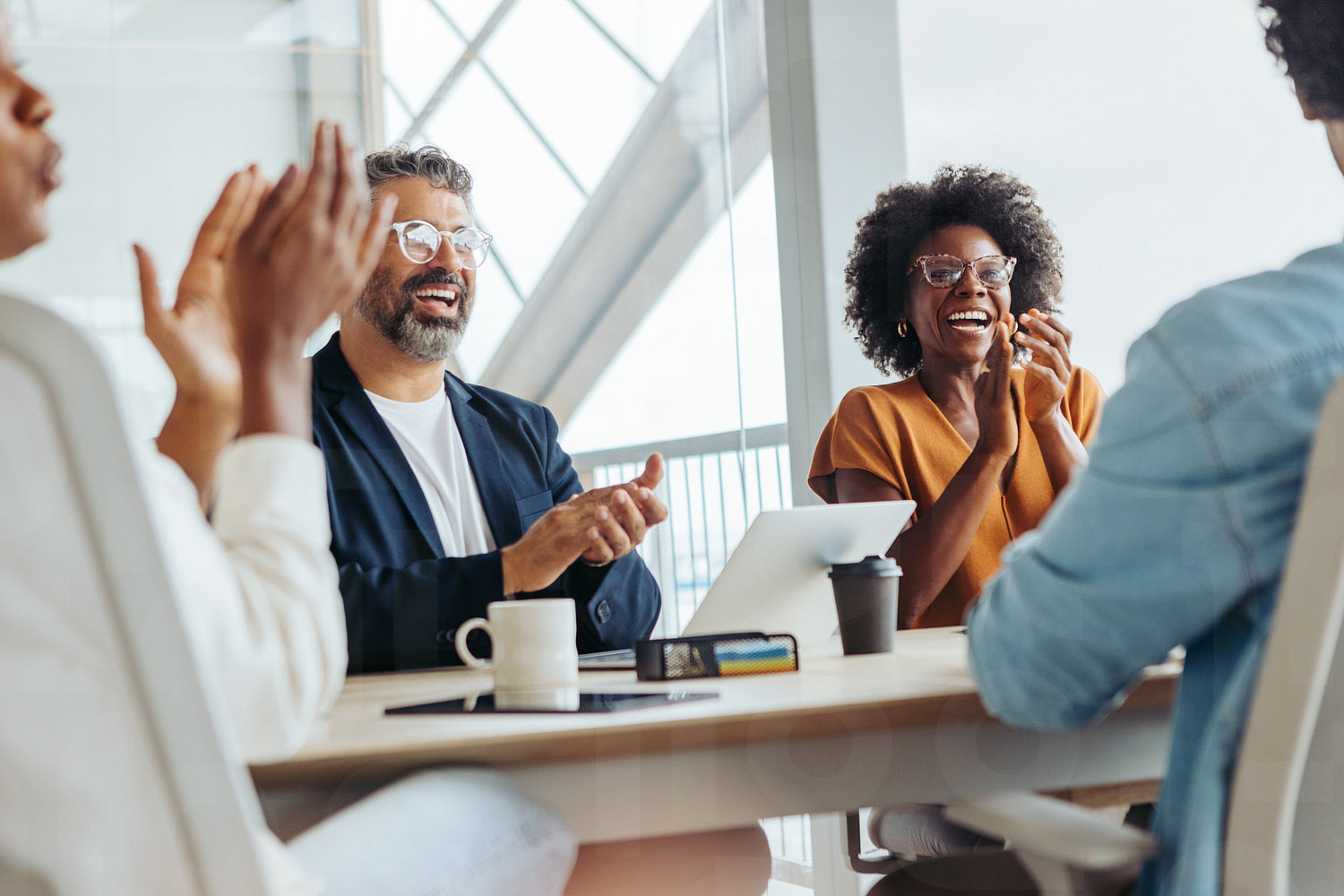Professional colleagues in a modern office collaborate and discuss a creative project. They applaud and celebrate their successful teamwork and business meeting, showcasing diversity and happy working environment.