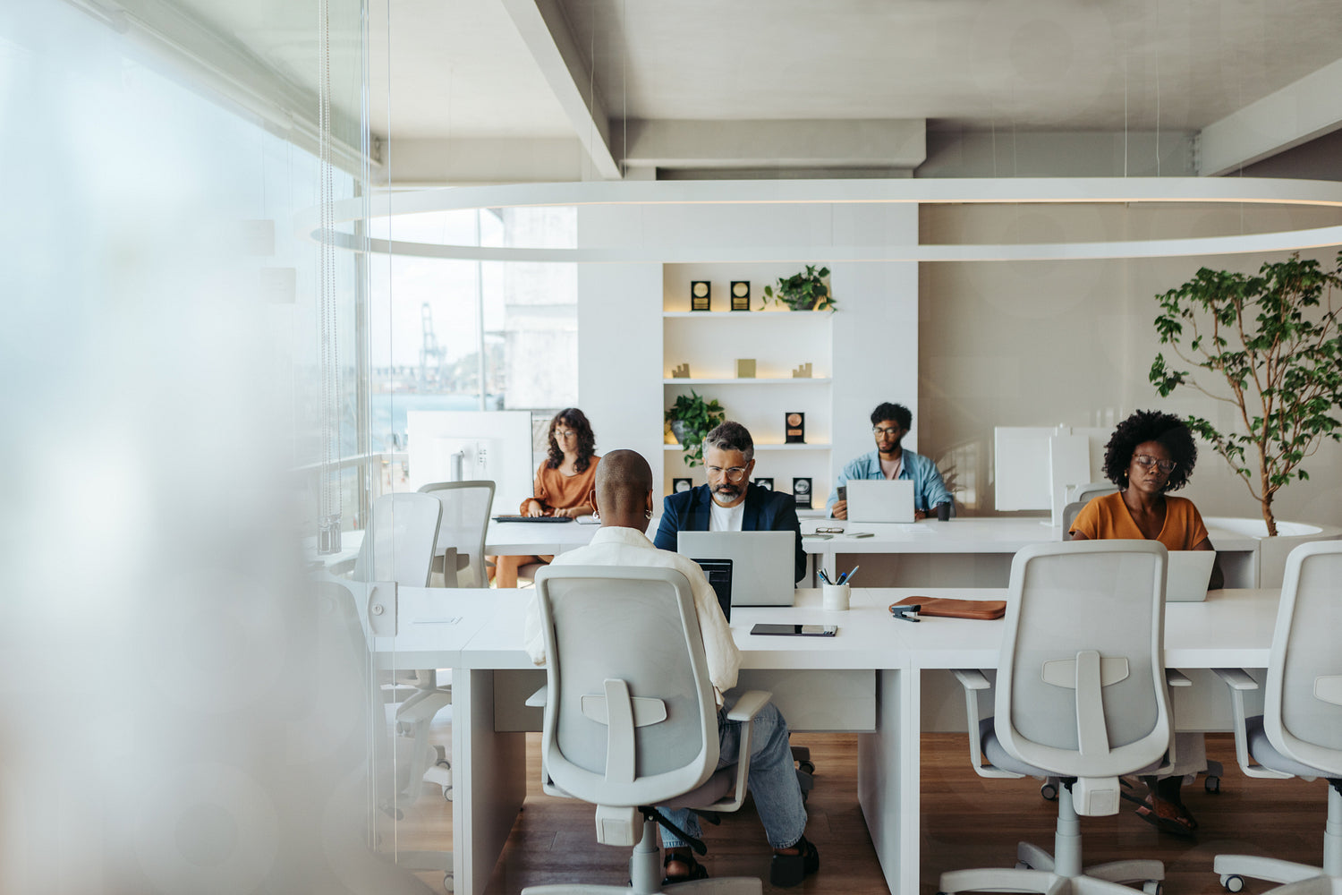 Business professionals working together in a diverse coworking office. They are focused on their laptops, collaborating and demonstrating teamwork. A multicultural and creative workplace.