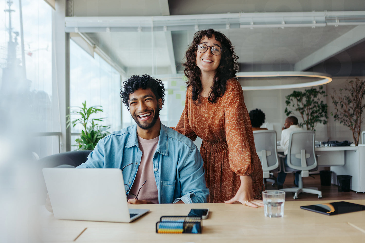Two professionals, a man and a woman, collaborating in a modern office. They smile, looking at the camera. A creative workspace represents teamwork, diversity, and success.