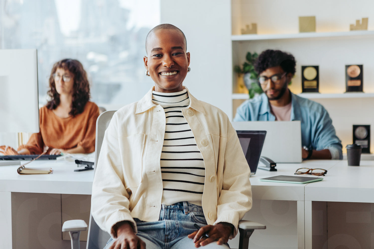Smiling black woman with glasses sits in an office. She is a successful entrepreneur surrounded by colleagues in a startup workplace. They all look at the camera, showcasing their business casual attire.