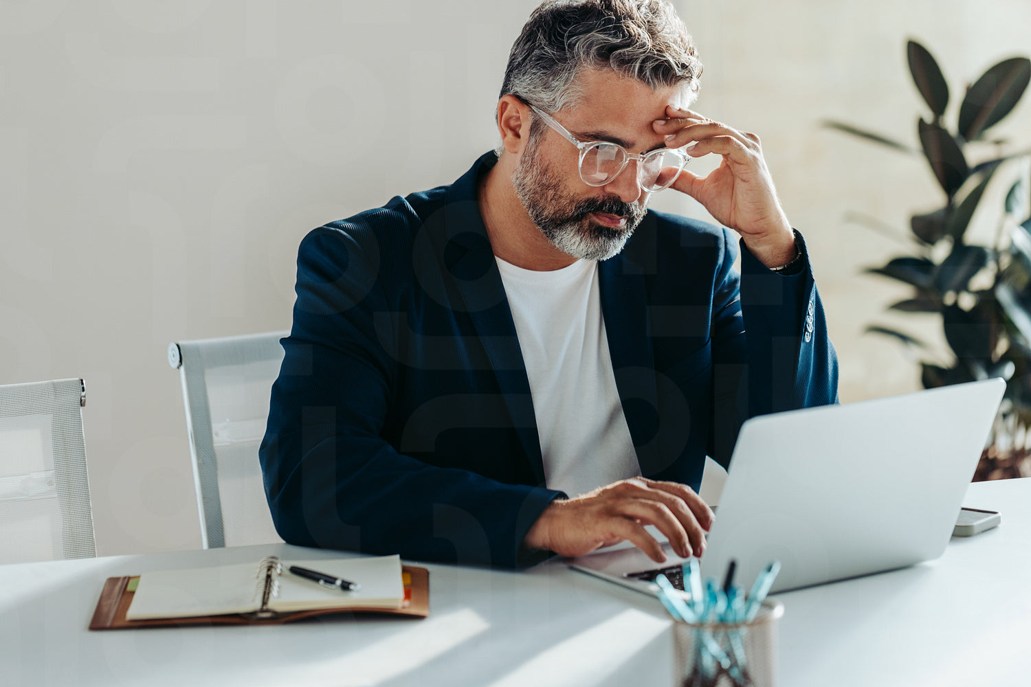 Mature businessman feeling stressed while working at laptop in a modern office setting. Man experiencing work fatigue and in a corporate environment with a pensive, overwhelmed expression.