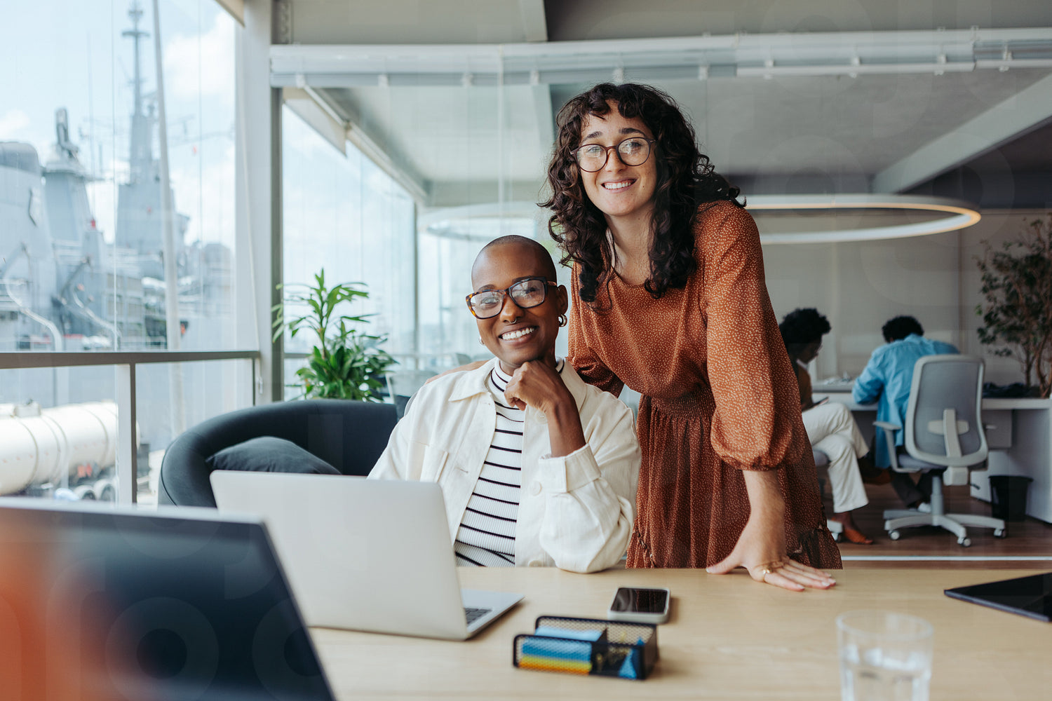 Two professional businesswomen collaborating in a modern office, working on a creative design project. With a laptop in front of them, they are happy and smiling. This diverse team embodies success and teamwork in the workplace.