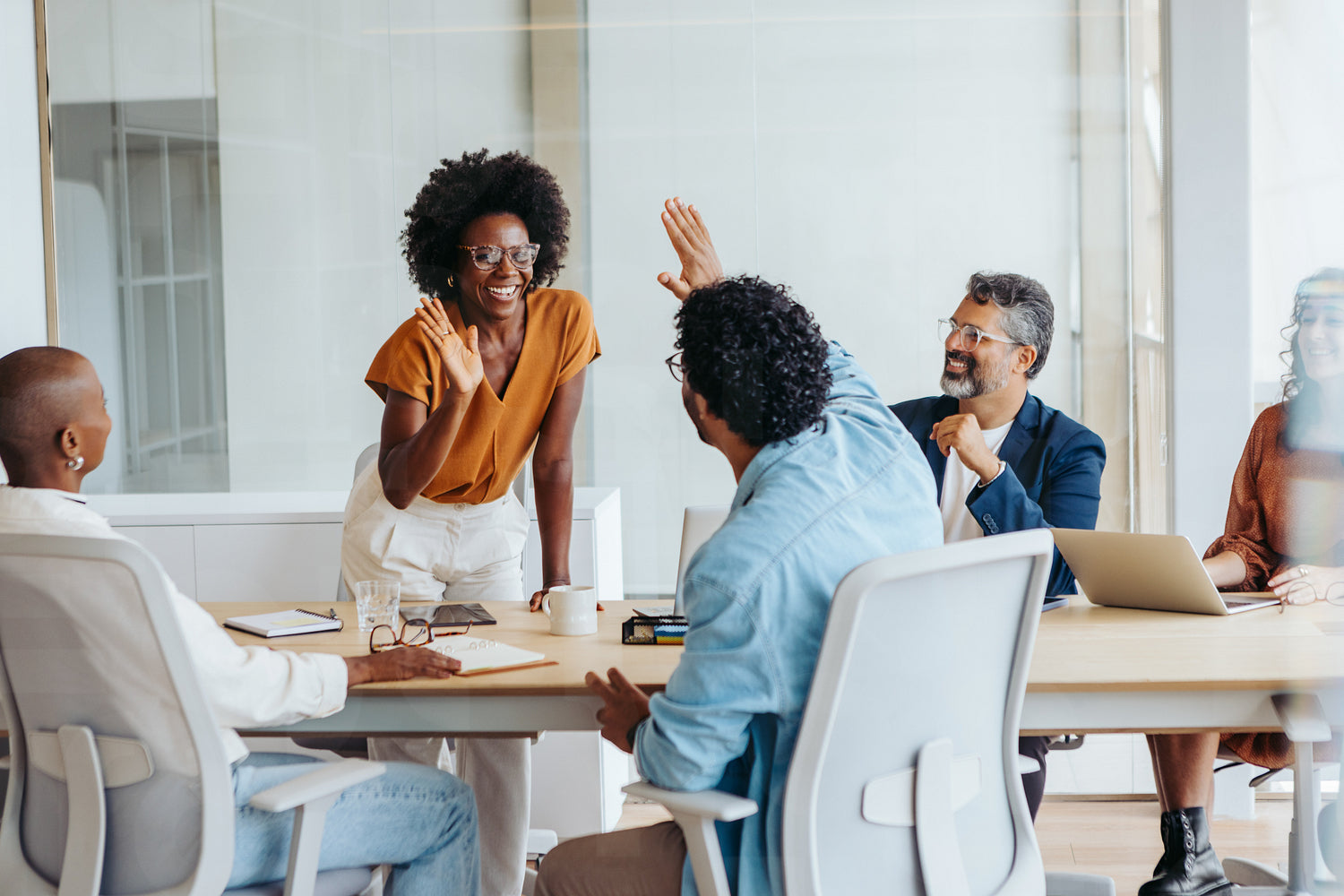 Colleagues celebrating a business project with a high five in an office boardroom. Group of people showcasing collaboration, teamwork, and success in a creative workplace.