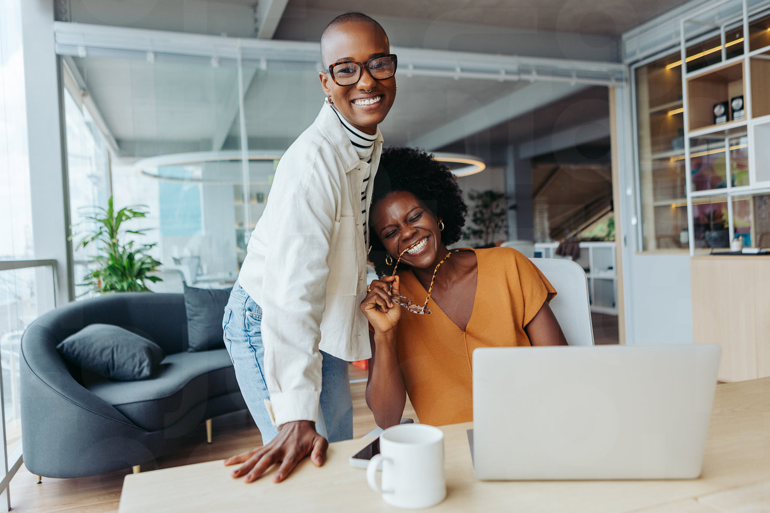 Two successful black women in a modern office collaborate on a laptop. They celebrate business success with smiles and laughter, showcasing their teamwork and creativity.