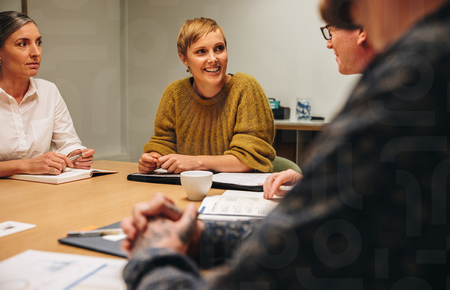 Smiling woman sitting with colleagues in conference room. Business professionals in meeting room.