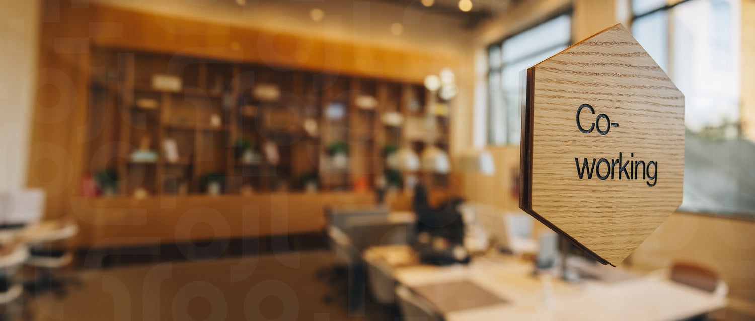 Co-working writing on wooden plate over a glass partition. Open plan office space for coworking.