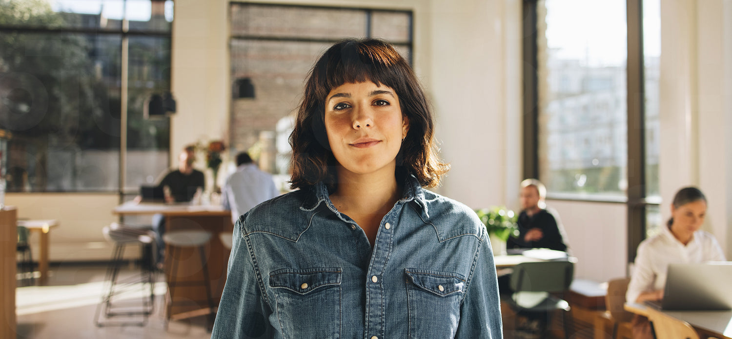 Portrait of freelancer standing in co-working space. Confident businesswoman looking at camera.