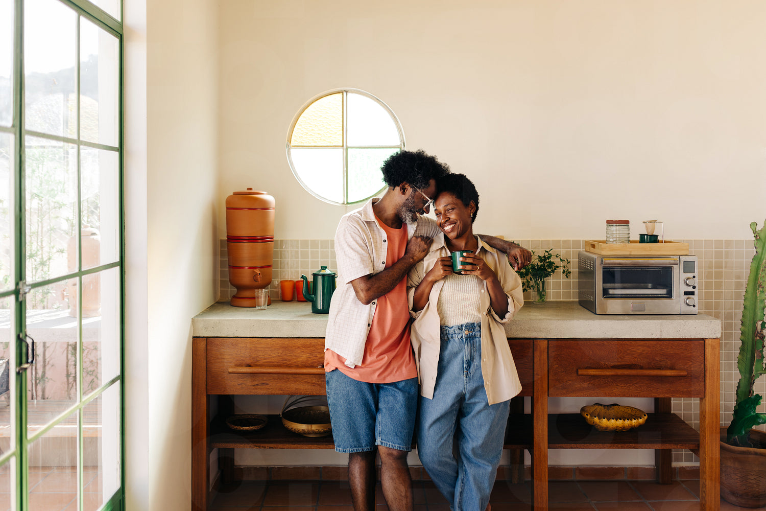 Brazilian couple sharing a romantic moment in their kitchen over a cup of coffee. Mature husband and wife enjoying an intimate moment of love and happiness in their home.