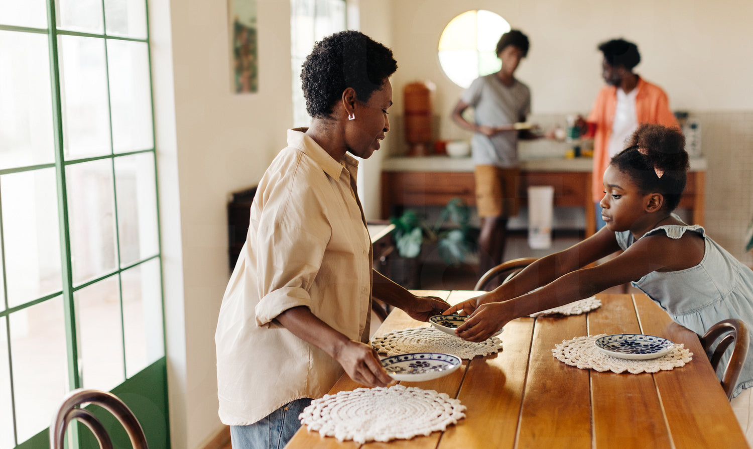 Daughter lovingly assists her mother in setting the table for a family breakfast. Black Brazilian family enjoying a moment of family togetherness as they come together for breakfast at home.