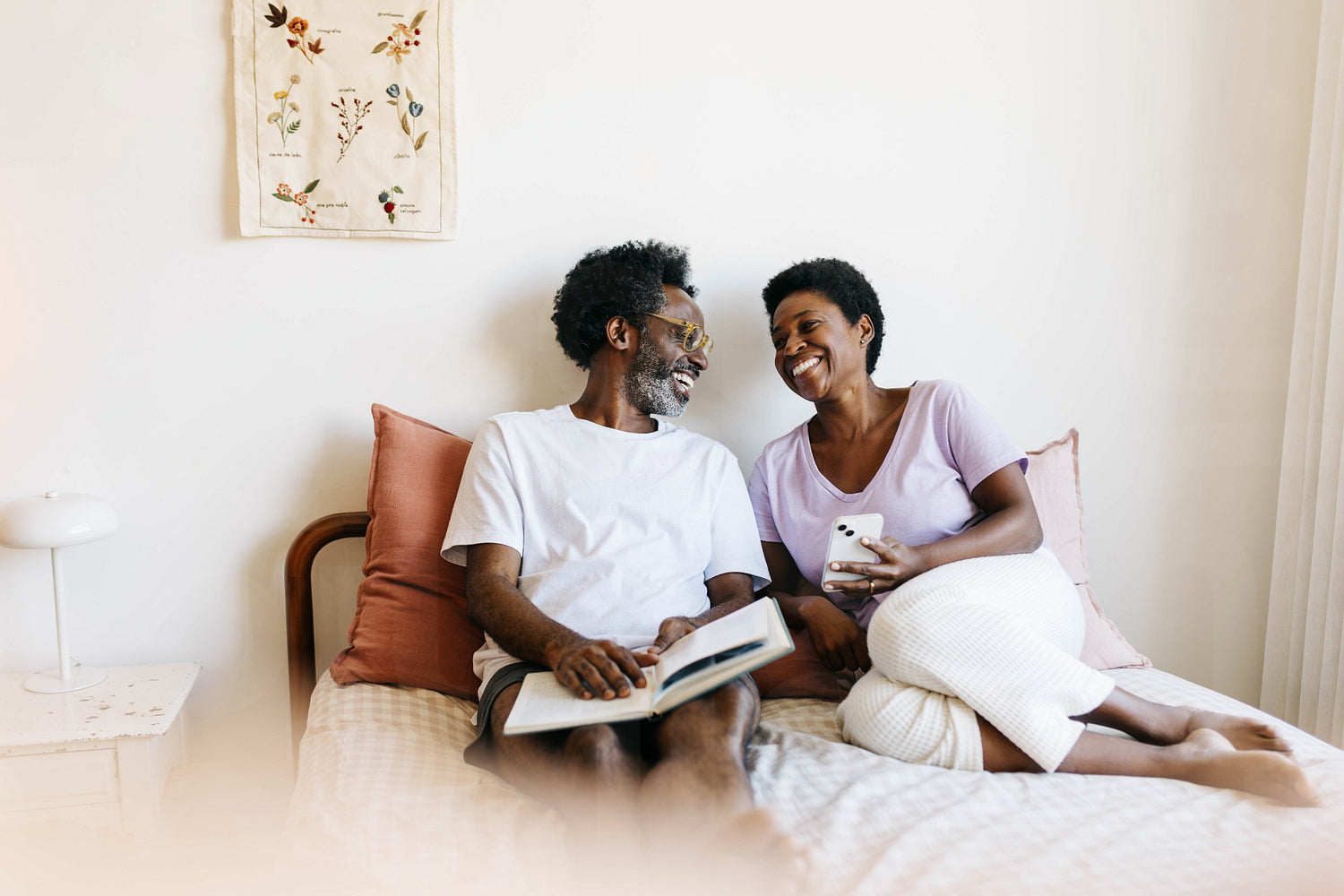 Happy married couple sitting in bed, the husband reading a book while his wife smiles and uses her smartphone for browsing social media. Mature couple enjoying quality time together in their home.
