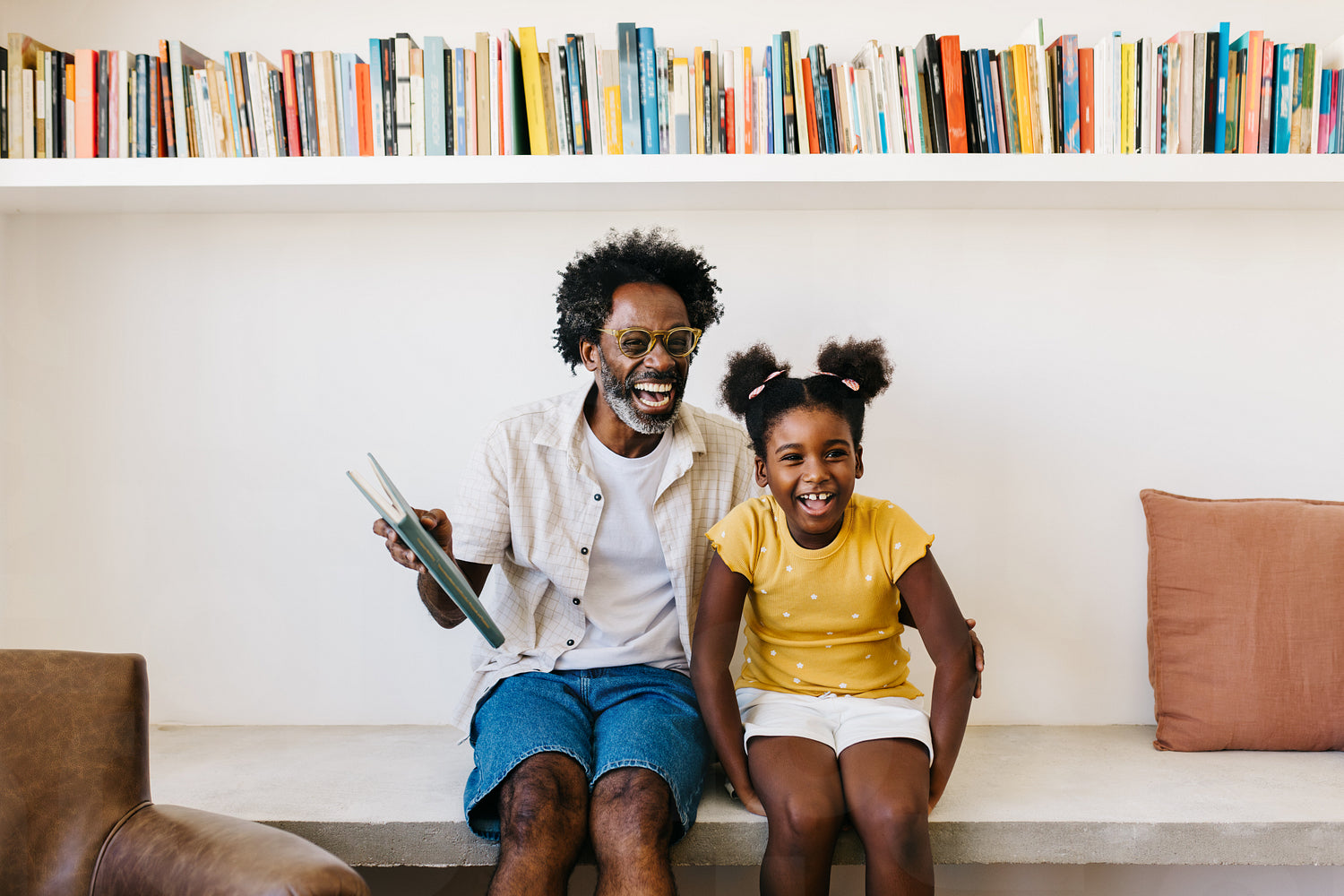 Mature father and his daughter sit and smile together in the living room. Happy dad holding a book from his collection, preparing to read to his daughter during their leisure time at home.