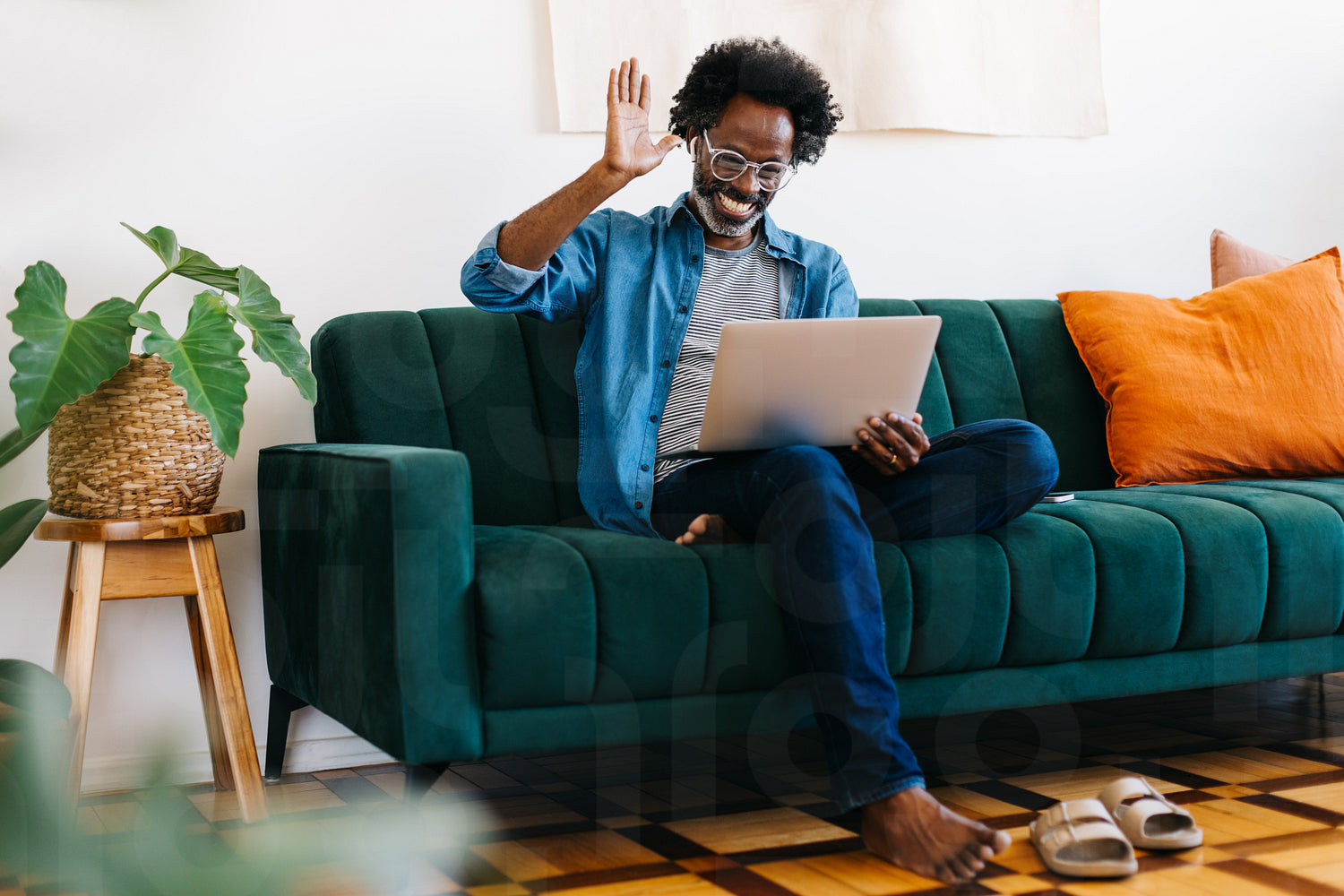 Happy mature black man working from home, engaging in a video call on his laptop. Remote worker sitting on a sofa, waving and smiling to his colleagues in a virtual meeting.