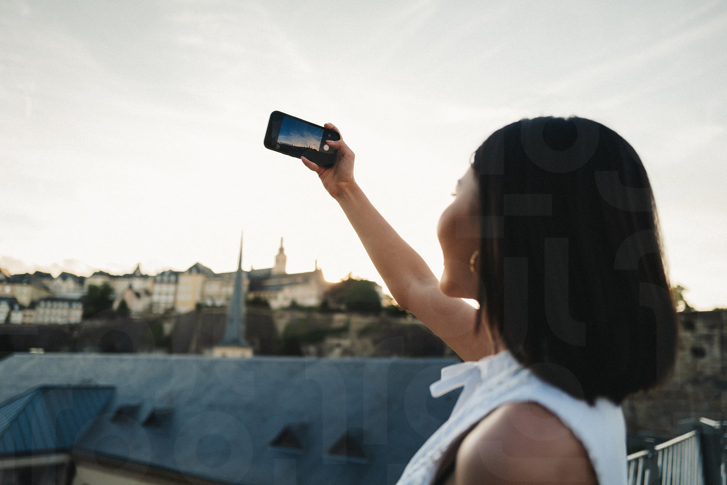 Tourist taking a picture of the view from a bridge in Luxembourg. Woman travelling around Europe during vacation. This photo has intentional use of 35mm film grain.