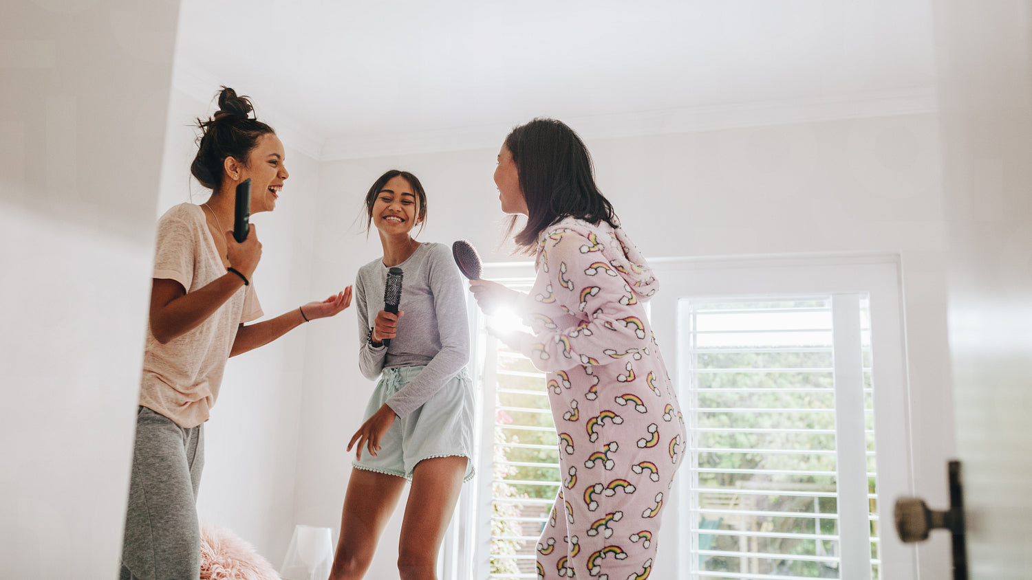 Three girls standing on bed holding hair brushes and remote control singing in karaoke style. Happy girls at a sleepover enjoying singing together.